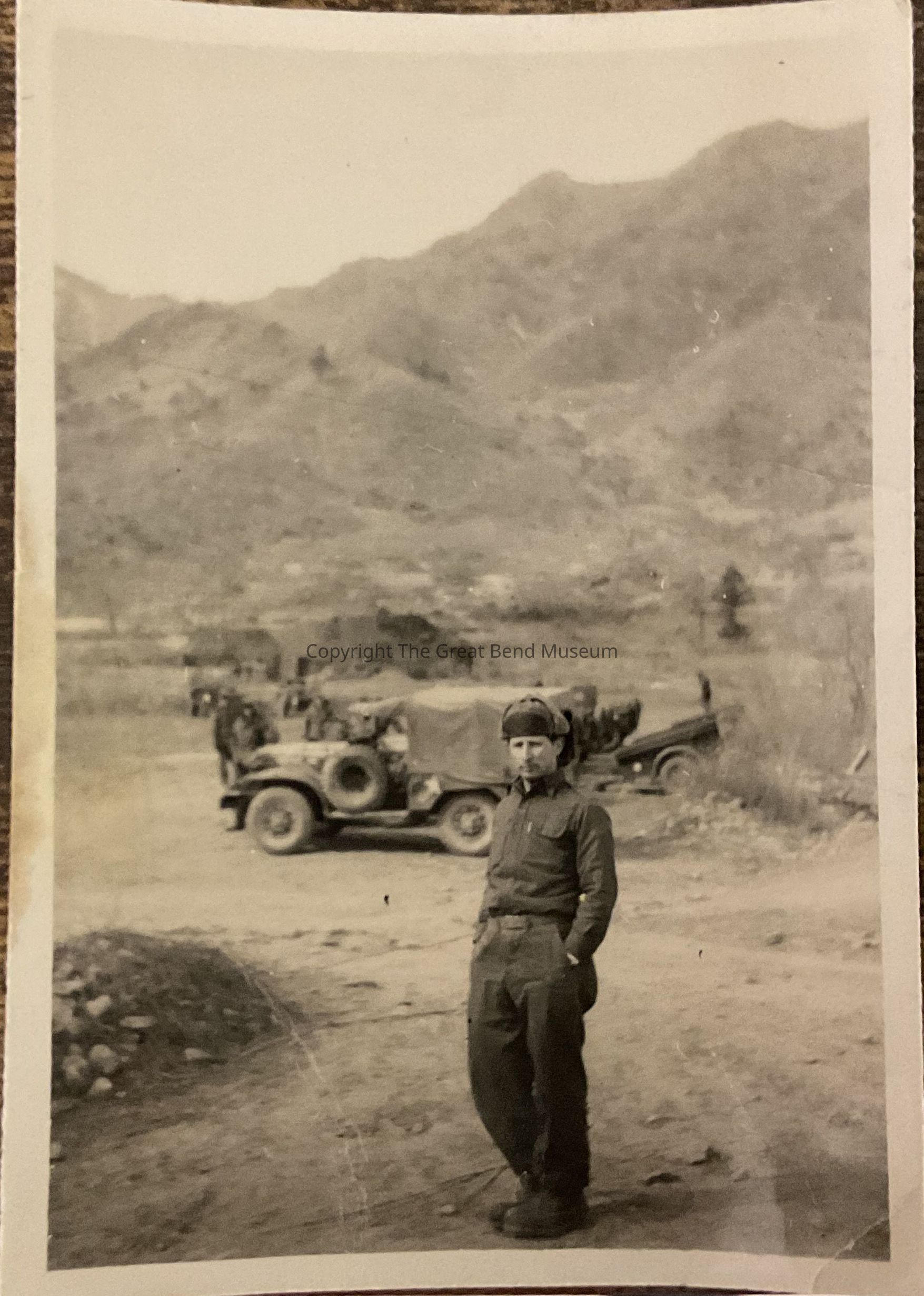 Soldier standing with a Jeep in background - 1952