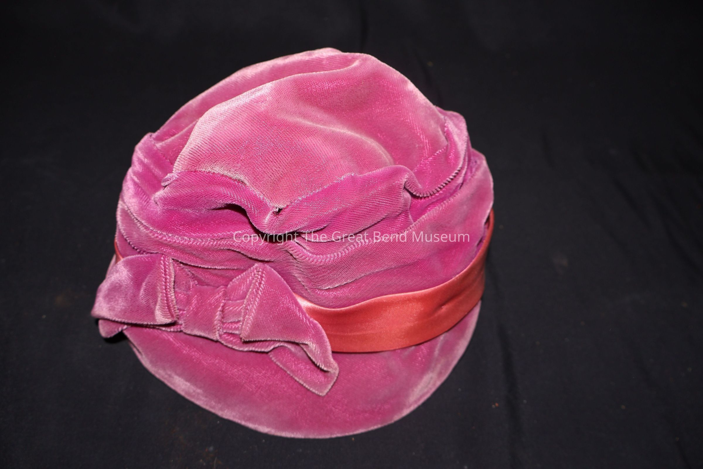 Dark pink hat with lighter pink ribbon and dark pink bow on the front. Manufacturers label #469310 "Union Made" United Hatters Cap + Millinery. Bell shape cloche hat with wire inside the brim.Clothing/Dress/Costume Details