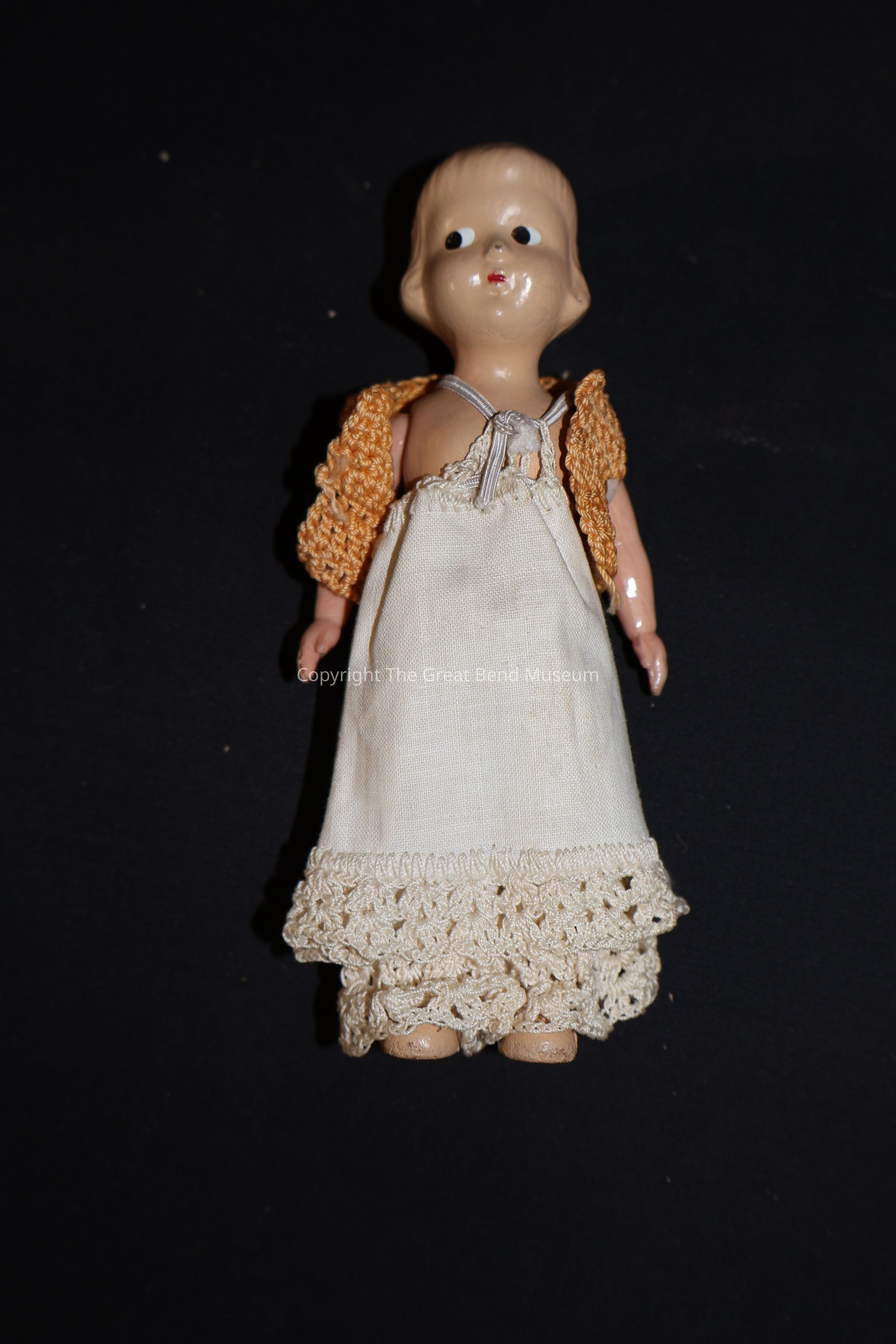 It is a plastic doll in a white dress and pantaloons that have embroidery around the hem. The top of the dress has elastic straps. There is also a yellow knit jacket.