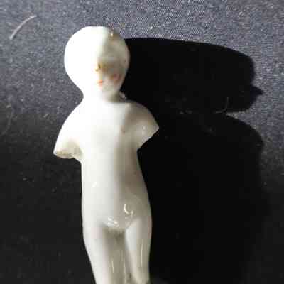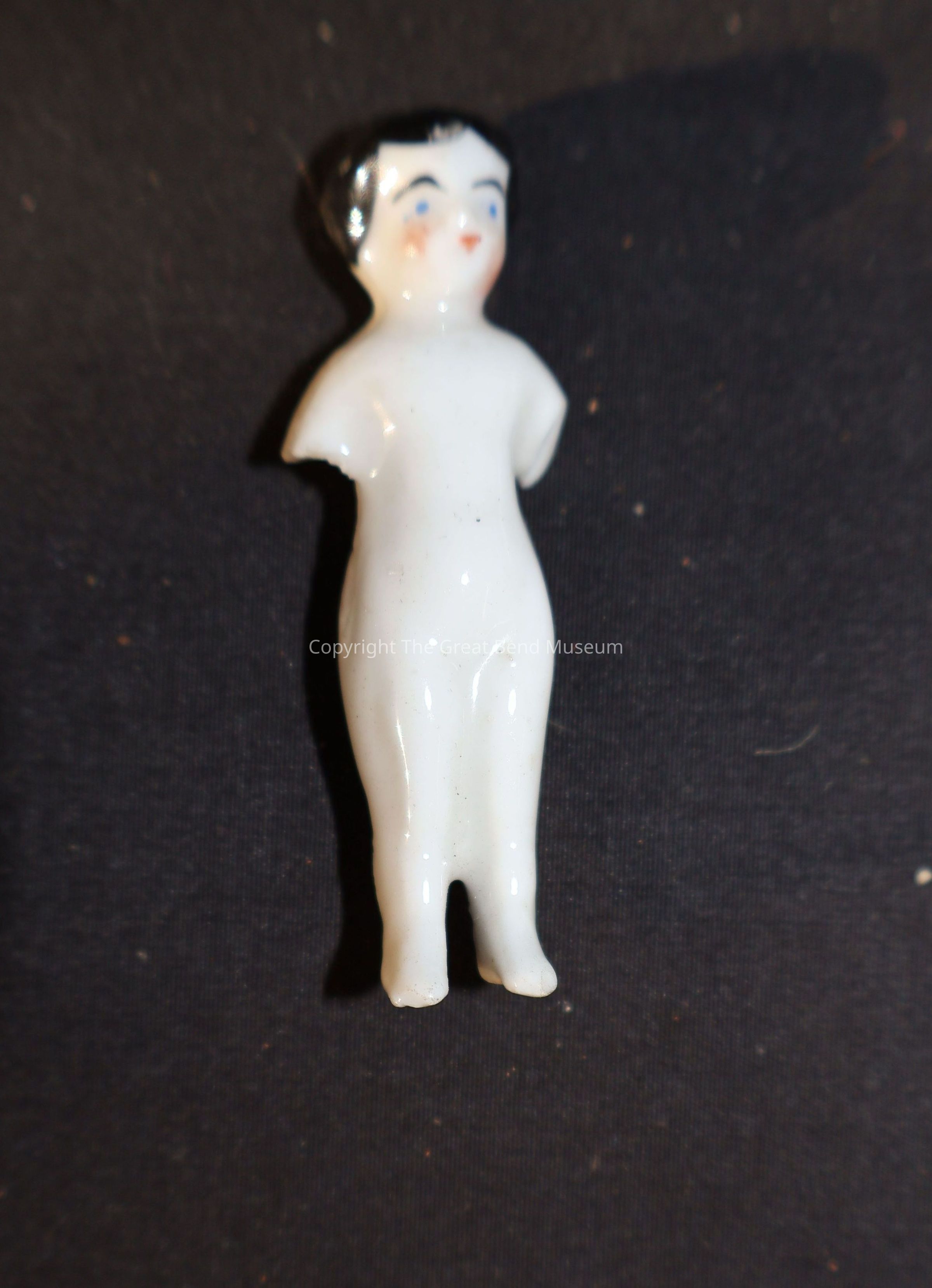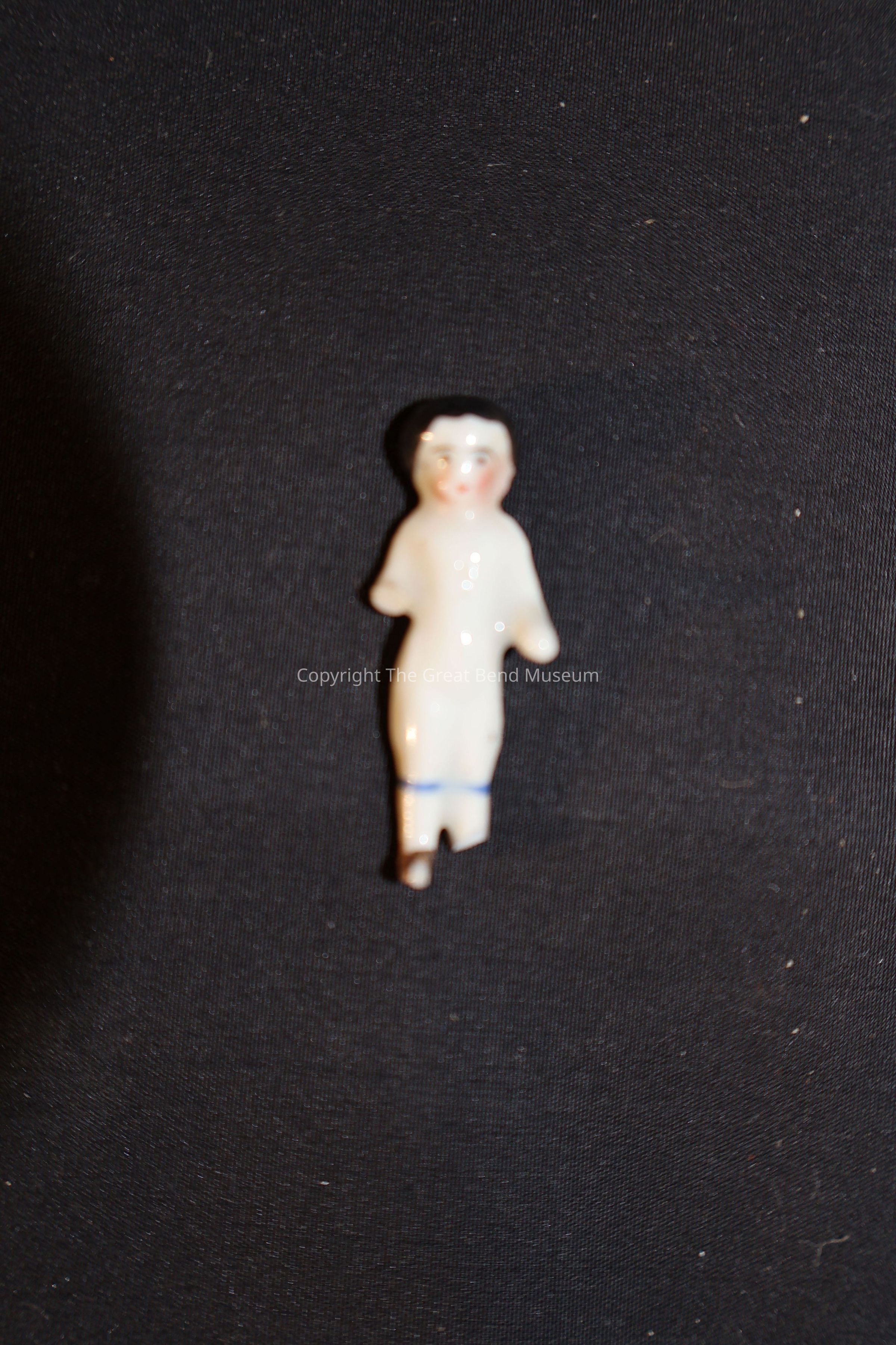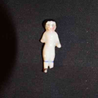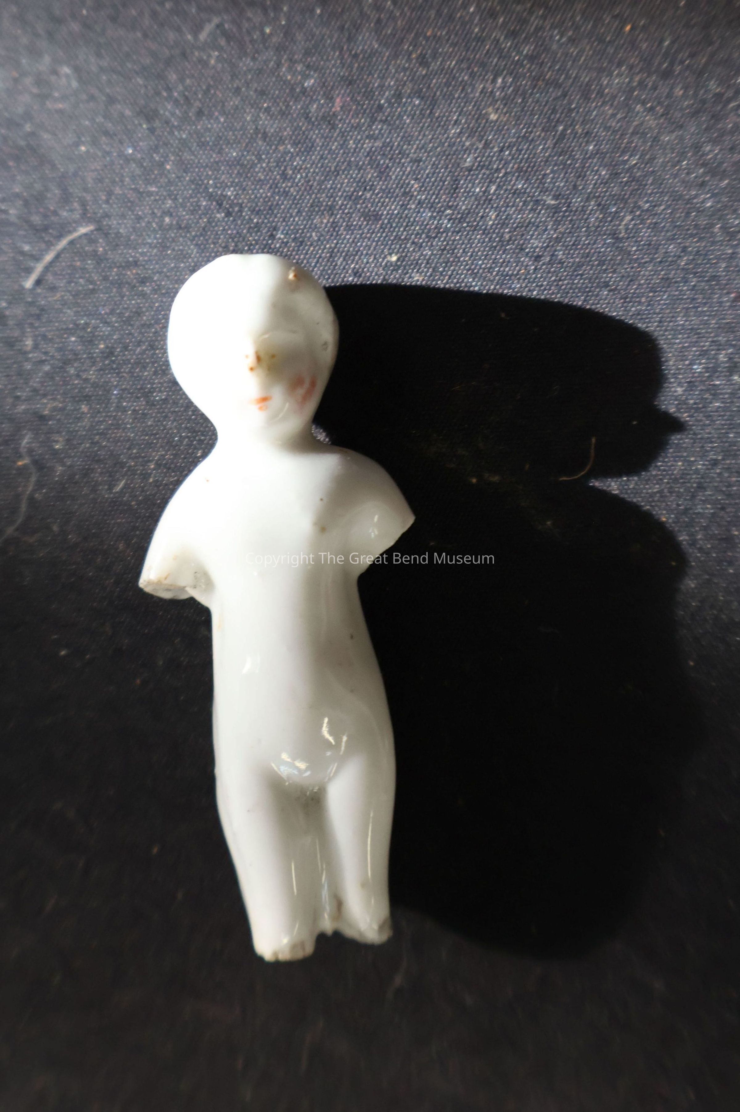 3. White body, red lips, pink on one cheek - arms and legs are broken off -- has "S" or "5" on back