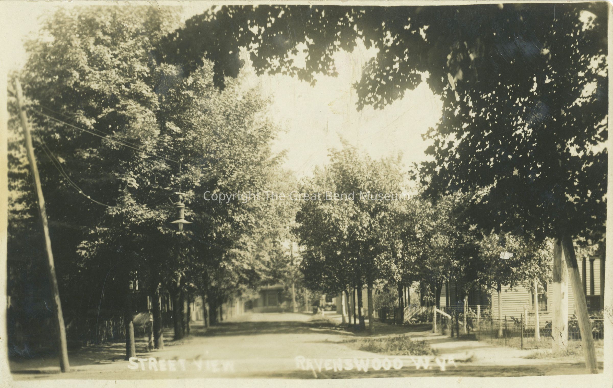 B/W photo postcard (standard postcard details on back - not used) Tree lined street - side street off a main intersecting street. Hanging street light on left - power pole on right (white base), street curves (house at end of street), sidewalks visible. Writing on front "Street View - Ravenswood, W.Va.Acquisition