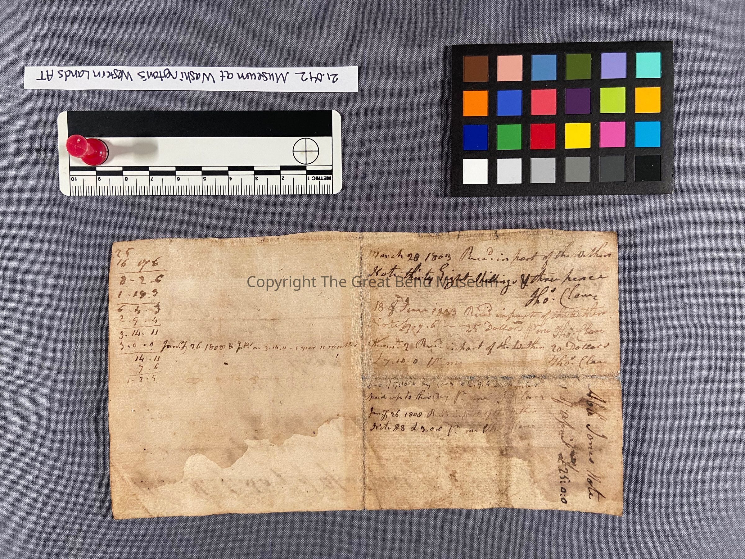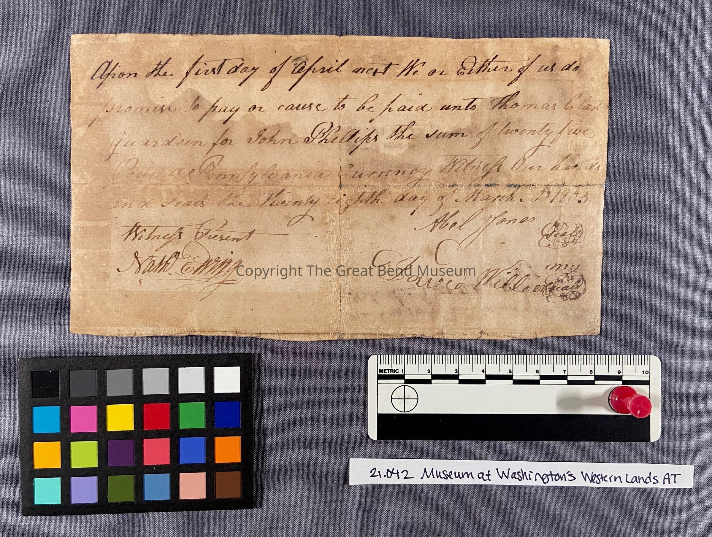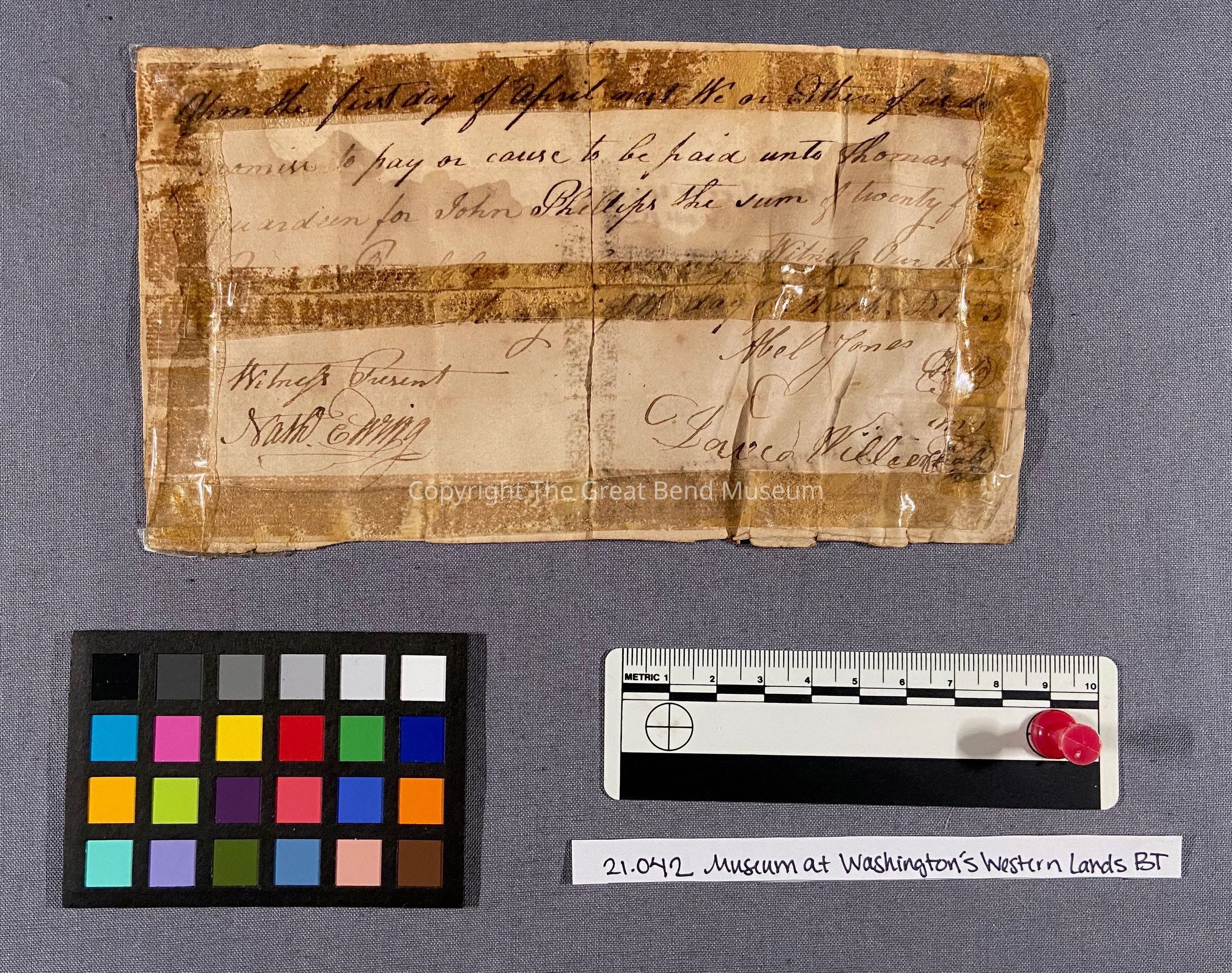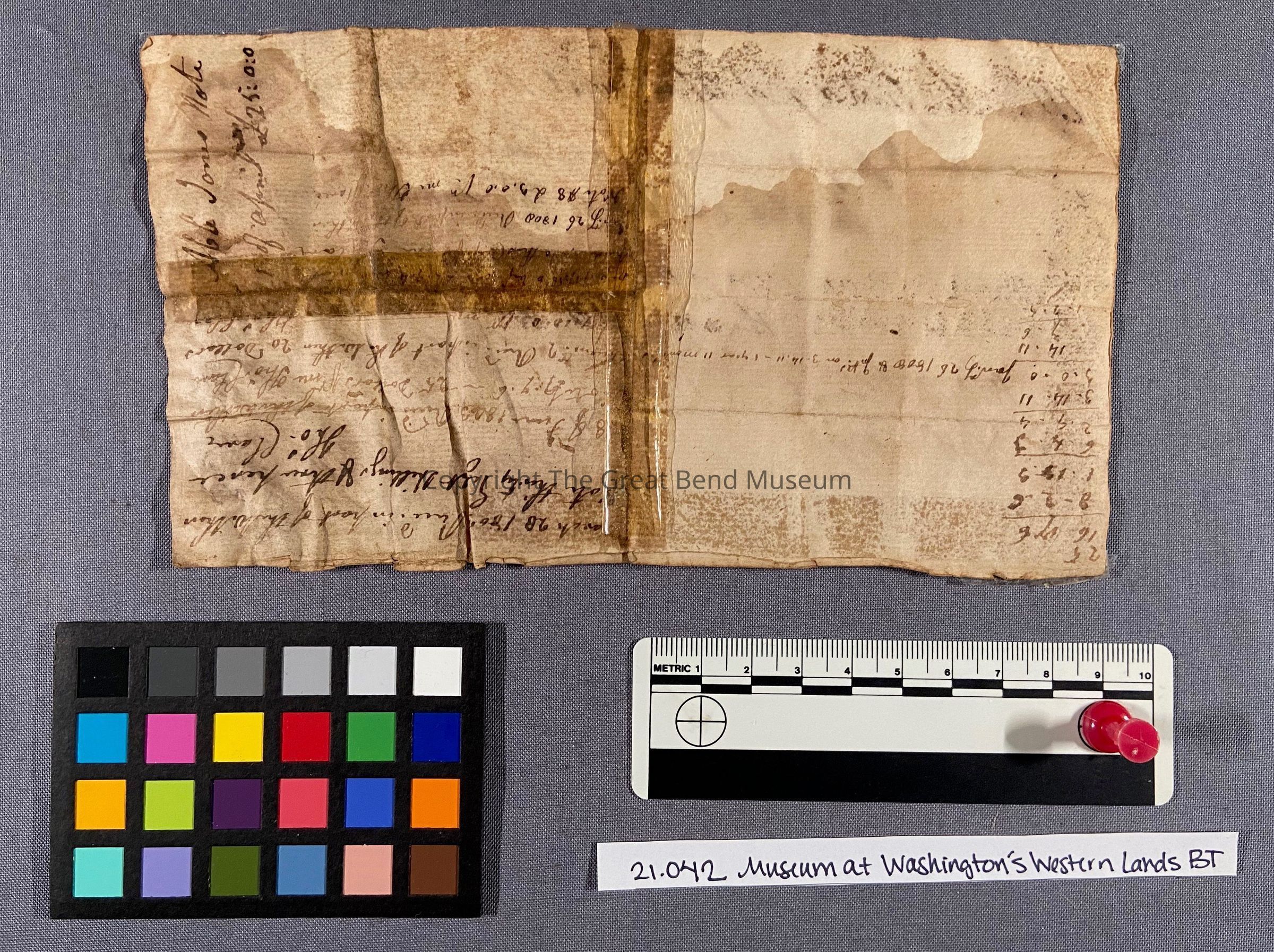The promissory note was originally folded multiple times, most significantly through the vertical and horizontal centers. These folds have not torn, though there is a pinhead-sized loss at the intersection of the two, where the document was worn when folded.