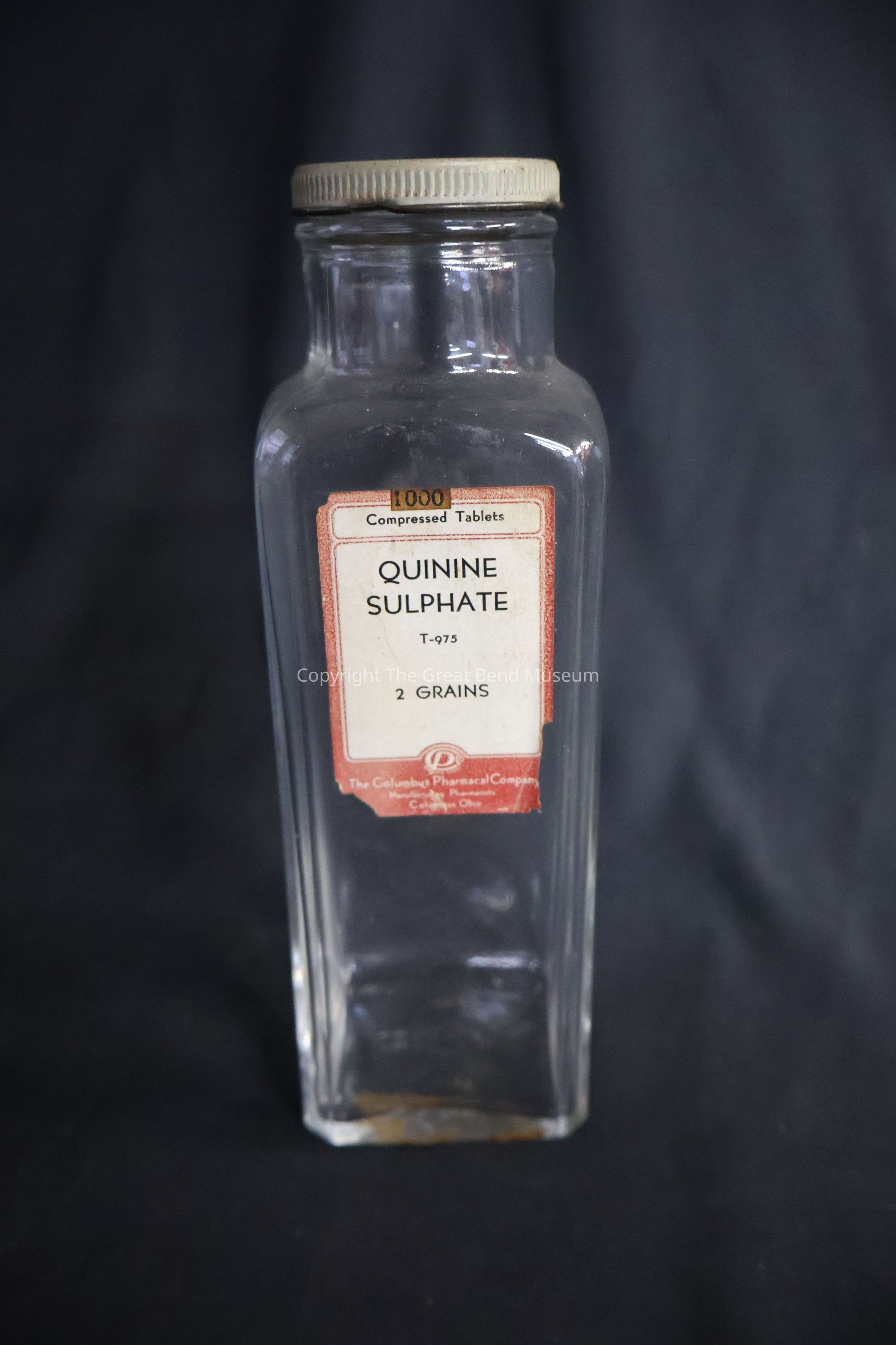 Clear 4 sided medicine bottle with label that says "Quinine Sulphate", "2 grains", and "compressed tablets" at the top. Label is white with a red border. Has gray screw on lid with red lettering. Has "12" and an "I" inside a diamond "5" embossed on the bottom.Acquisition
