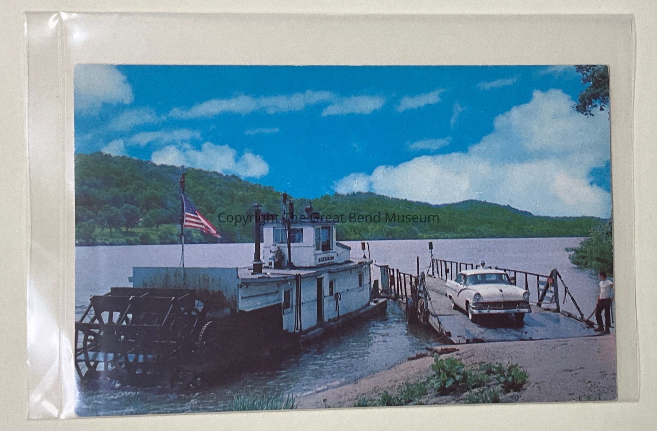 Postcard with photo of the Ravenswood Ferry at the ferry landing.1950's Ford automobile is exiting the ferry. Vehicle is pink/white. Man is standing far right directing driver. Blue skies, very green hillside.Acquisition