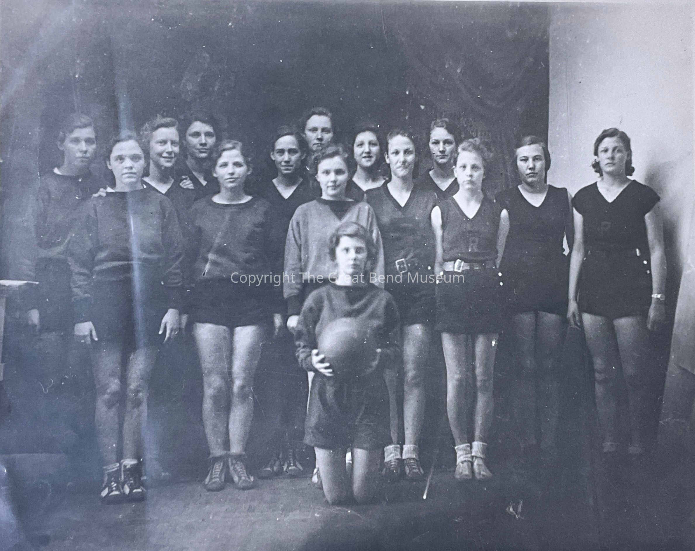 Ravenswood High School Girls Basketball team - 1932, 15 girls standing in uniform with girl in front kneeling holding a basketball. Names of those picture: