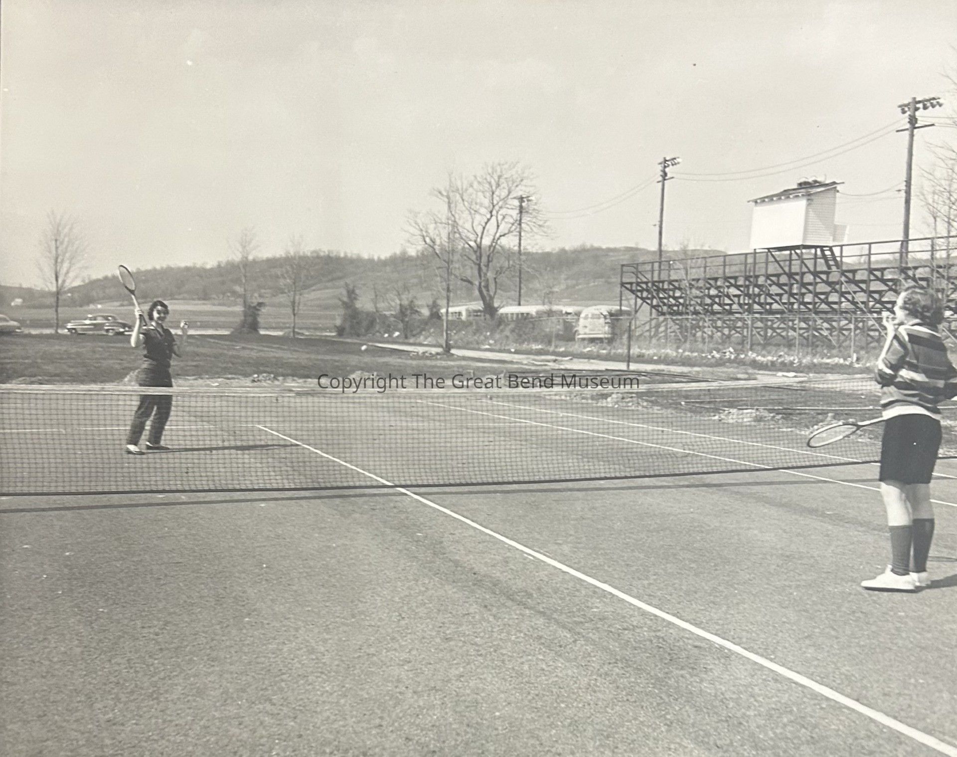 2 girls playing tennis. School buses, bleachers, annoucers booth, cars parked in backgroundAcquisition