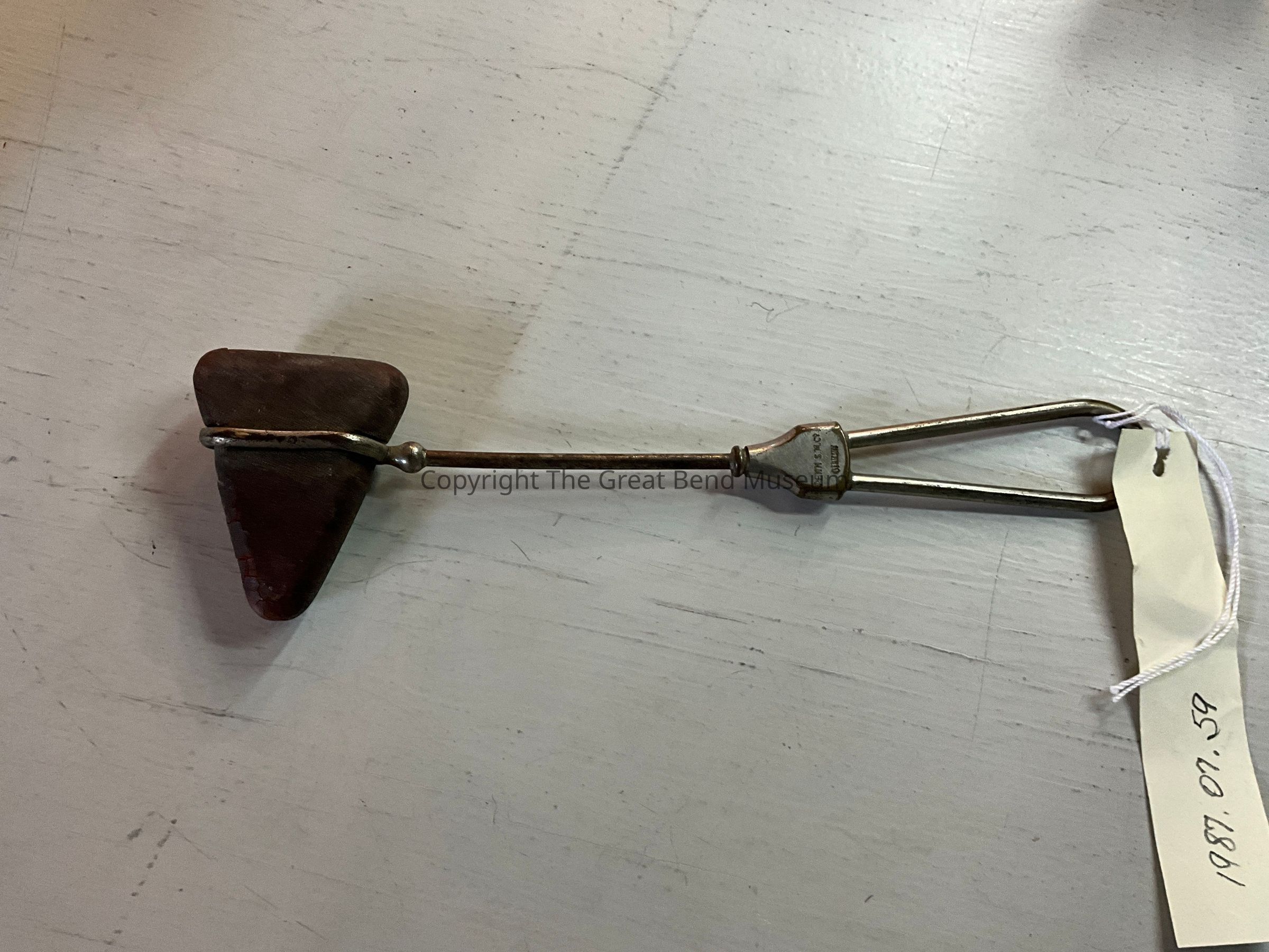 Hard rubber headed hammer. Thin rod holding hammer head.,with thin looped metal rod making up the handle. Has ‘PENN. s. M. C9” and “Germany’. embossed on the handle.Acquisition