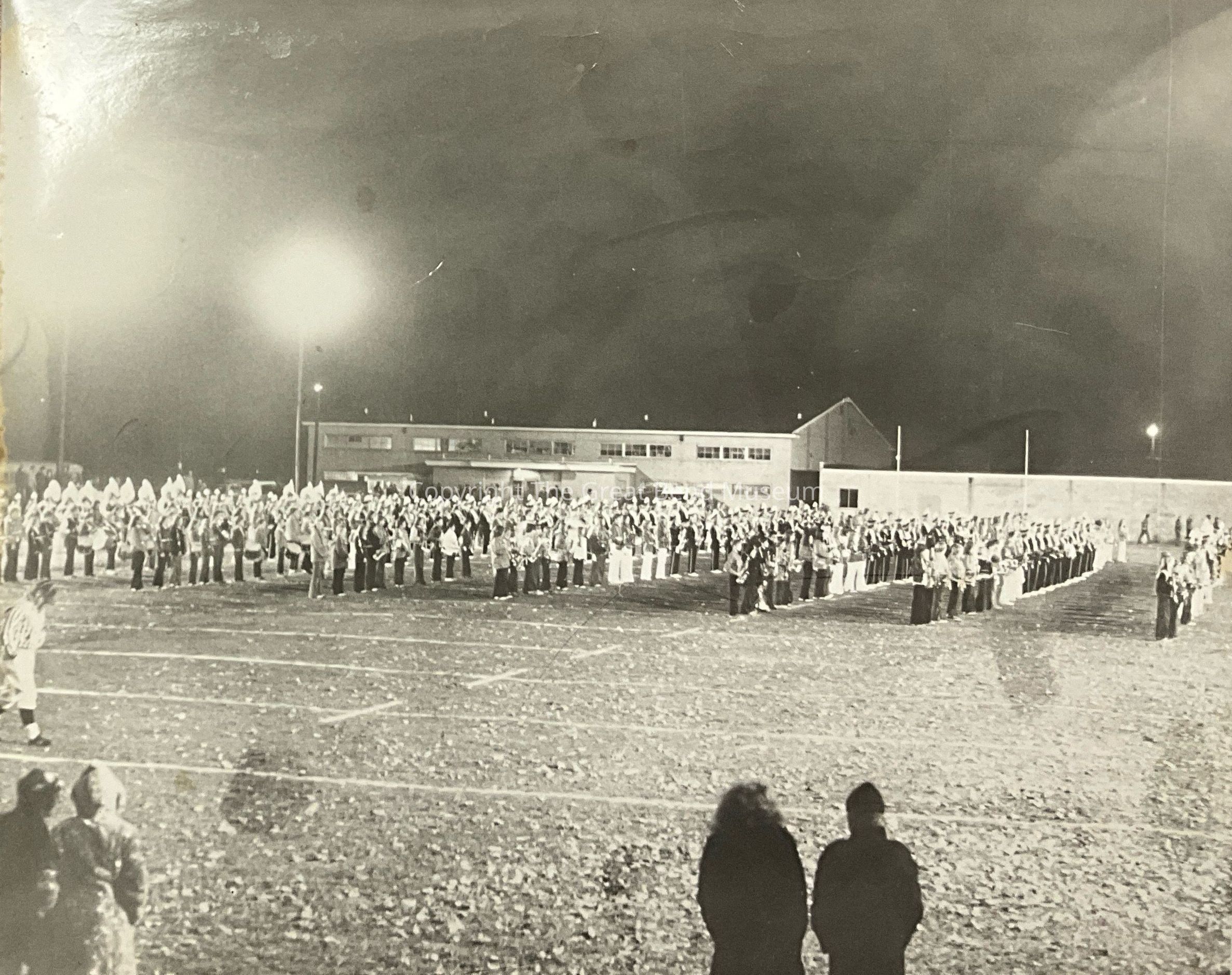 The back says, “Bands fill the biggest part of the field as they prepare to march together and present pre-game show - 435 members, excluding majorettes. The Photo was taken by Lois McCann at 417 Fitzhugh Street, Ravenswood, WV. I’m guessing it was take in 1970 or 71.Acquisition