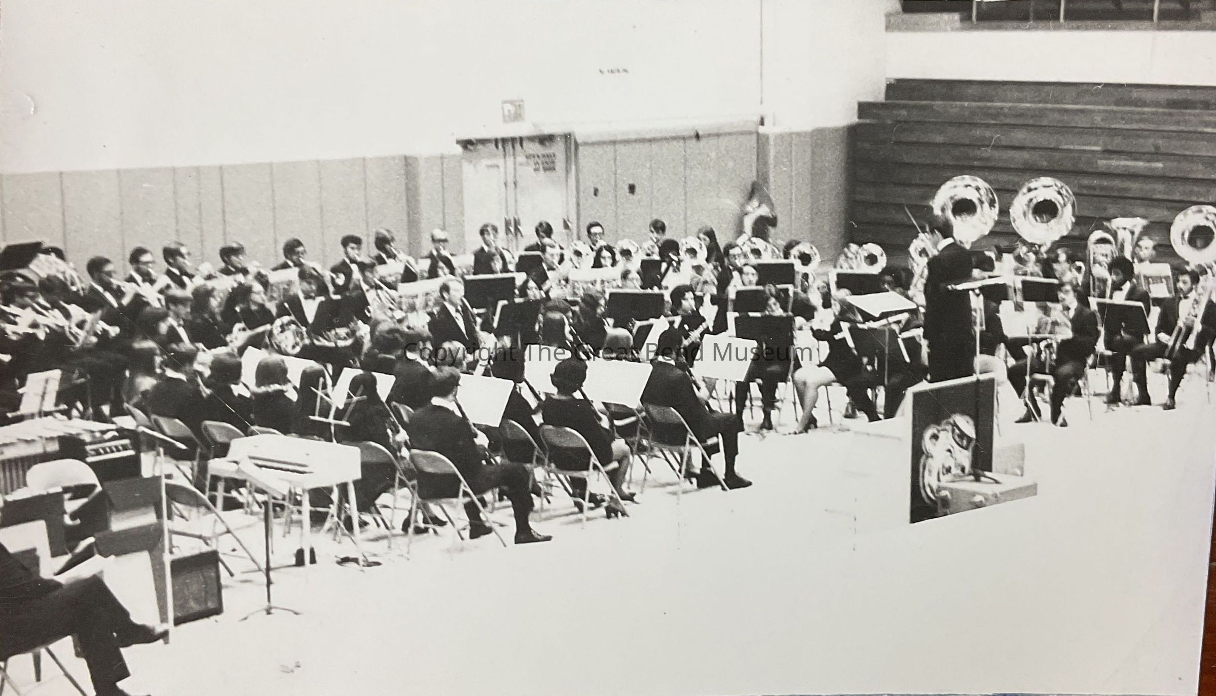Band performing at some sort of concert. Director conducting from stand.
