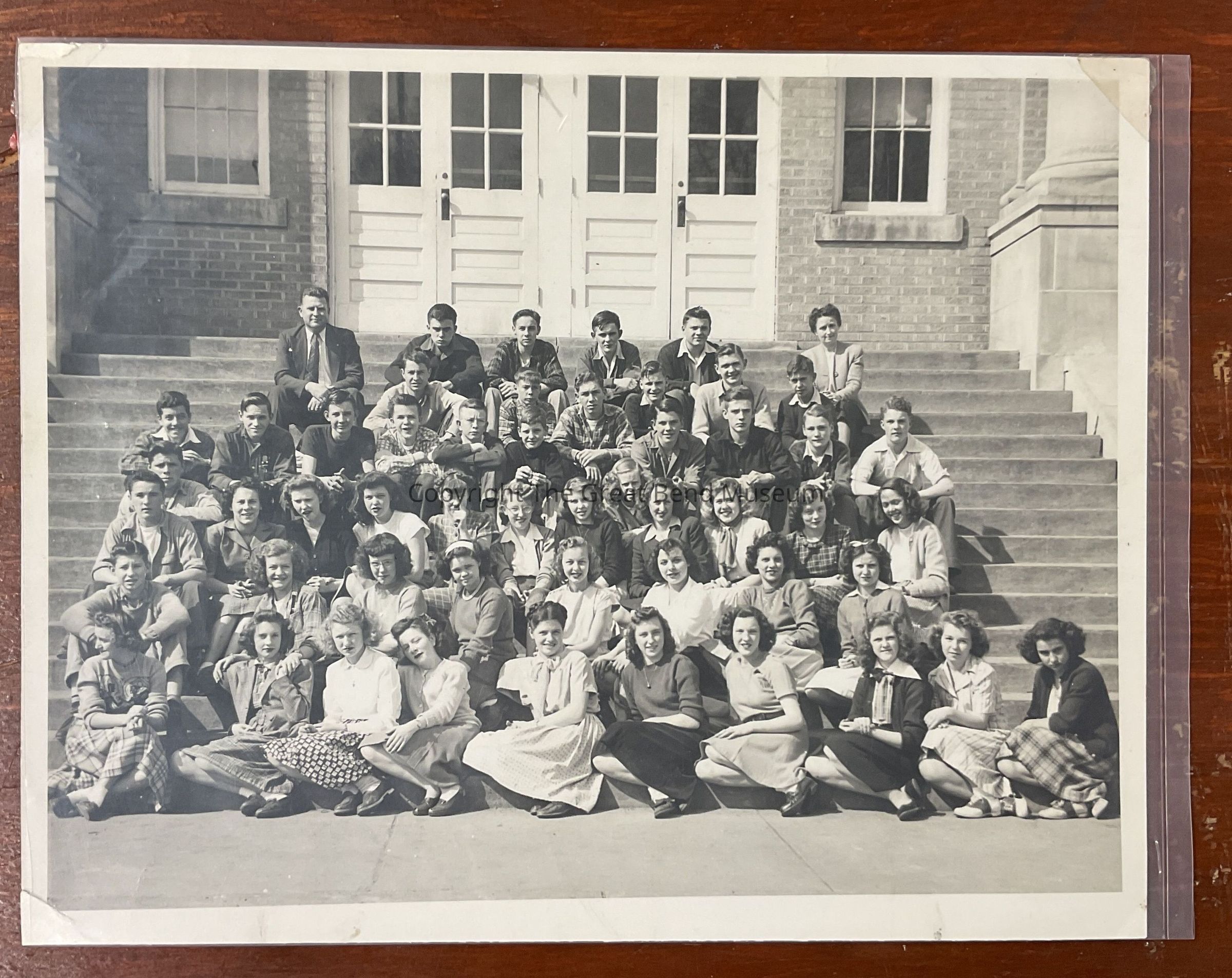 Picture of class of kids sitting on steps in front of High School. Names listed on back: 1st row: Margaret Owens, Helen Bennett, Vivian McCroskey, Leatha Bunner, Jackie Patterson, Nancy Rector, Mary Swiney, Kathryn Gorrell, Dorothy Allman, Sarah Wildman; 2nd row: Bill Morgan, Betty McCullough, Darylene Ward, Mary Wolfe, Joan Lamp, Ellen Garden, Jackie McCarthy, Opal Conger; 3rd row: Archie Barber, Bob States, Ethel Shockey, Anna Seals, Margaret Warth, Blanche Roush, Flora Flat, June Taylor, Rita McCullough, Olive Gorrell, Pauline Moore, Evelyn Roush, Mary Lou West; 4th row: Carl West, William James Jr, Bill Leonard, Eddie Critchfield, Leslie Sallie, James Bare, Gene Never, Marshall Cox, Dayton Gorrell, Don King; 5th row: Richard Bush, Reuben Brown, Ray Flint, James Thomas, Johnny Kelly, Gordon Cottrill; 6th row: Mr. Good, Sponsor, Joe McCoy, Robert Todd Jr., Allen Roll, Charles Stewart, Mrs. Jarrett, sponsor. Unpictured: Cecil Boggess, June Boggs, Barbara Kinzel, Mildred Miller, Bill Matics, Helen Wins, Joan Rawley, Dorothy McIntyre.