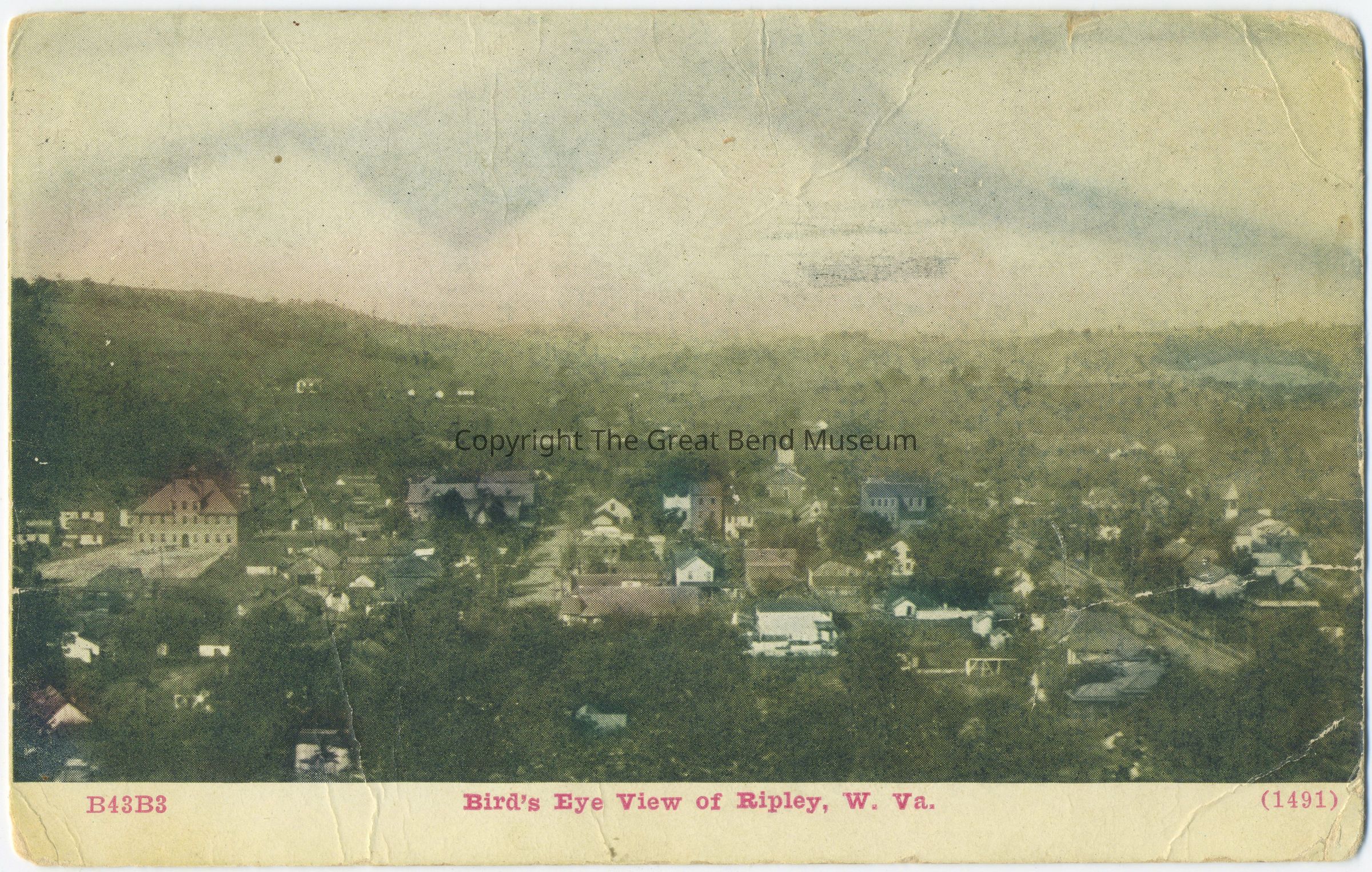 Color photo postcard - Ripley taken from hillside (or aerial) of Rte 33 looking across town. Left frame - red/ brown root brick building; center. Right of photo is a church. Hills in the background. "B43B3" "birds eye view of Ripley, WV." (1491)Subject Person/Organization