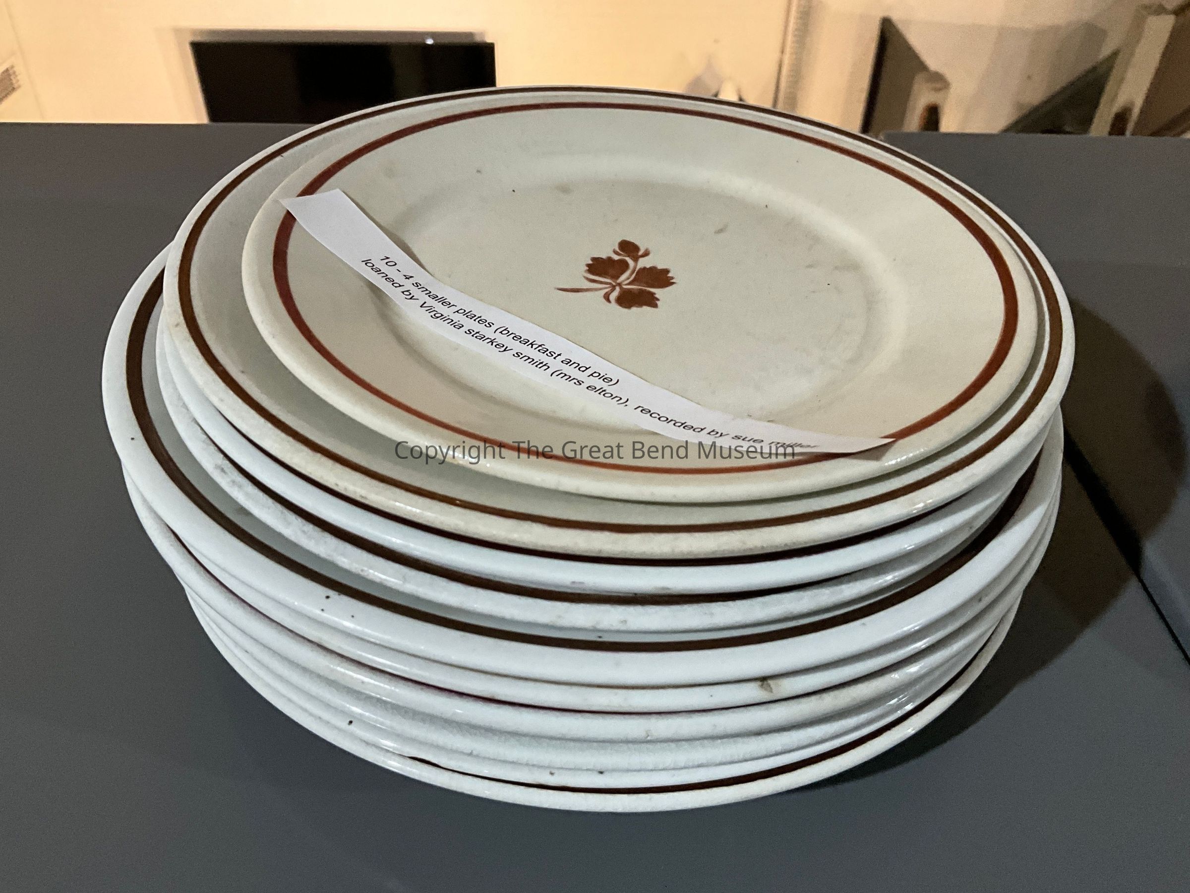 white ironstone plate with brown edging and tea leaf design in the center. Has "Royal Ironstone China, Mellor & Taylor & Co, England" printed on back.Acquisition