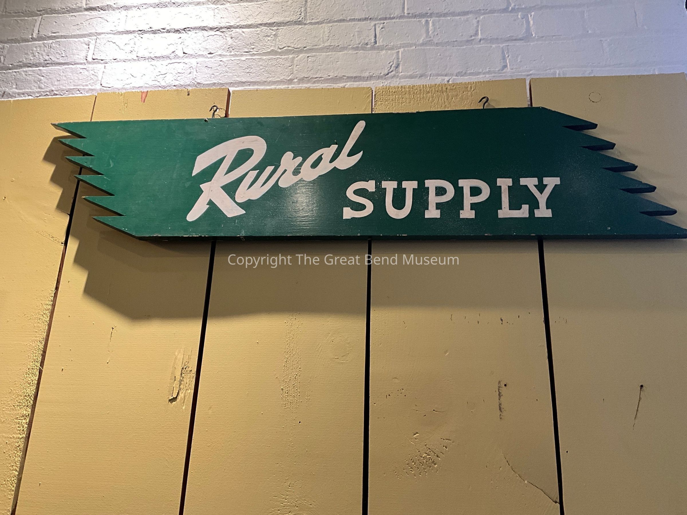 Green painted sign that has "Rural Supply" in white letters.Rural is in cursive - Supply is print. Painted on 1 inch plank with diagonal notches at both sides. Has metal hanging hooks at the top.Acquisition