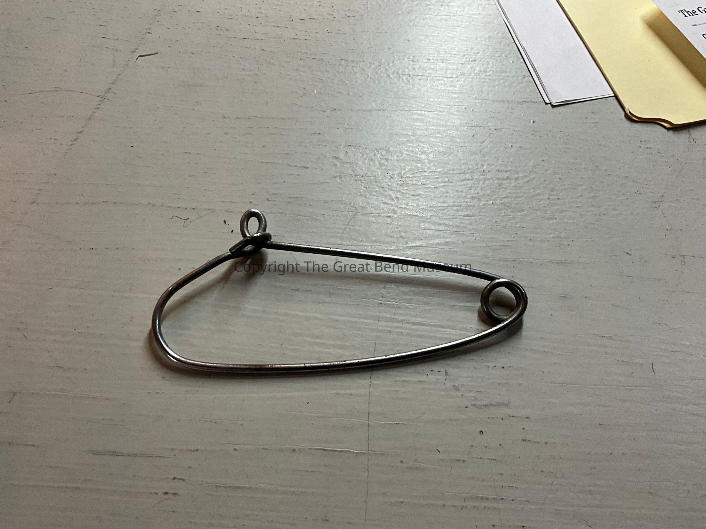 Large Safety pin shaped object, to hold instruments like forceps together in one place. Hole in the forceps would be used to feed them onto safety ring. Then the ring would be clamped together to keep them from falling off the ring.Acquisition