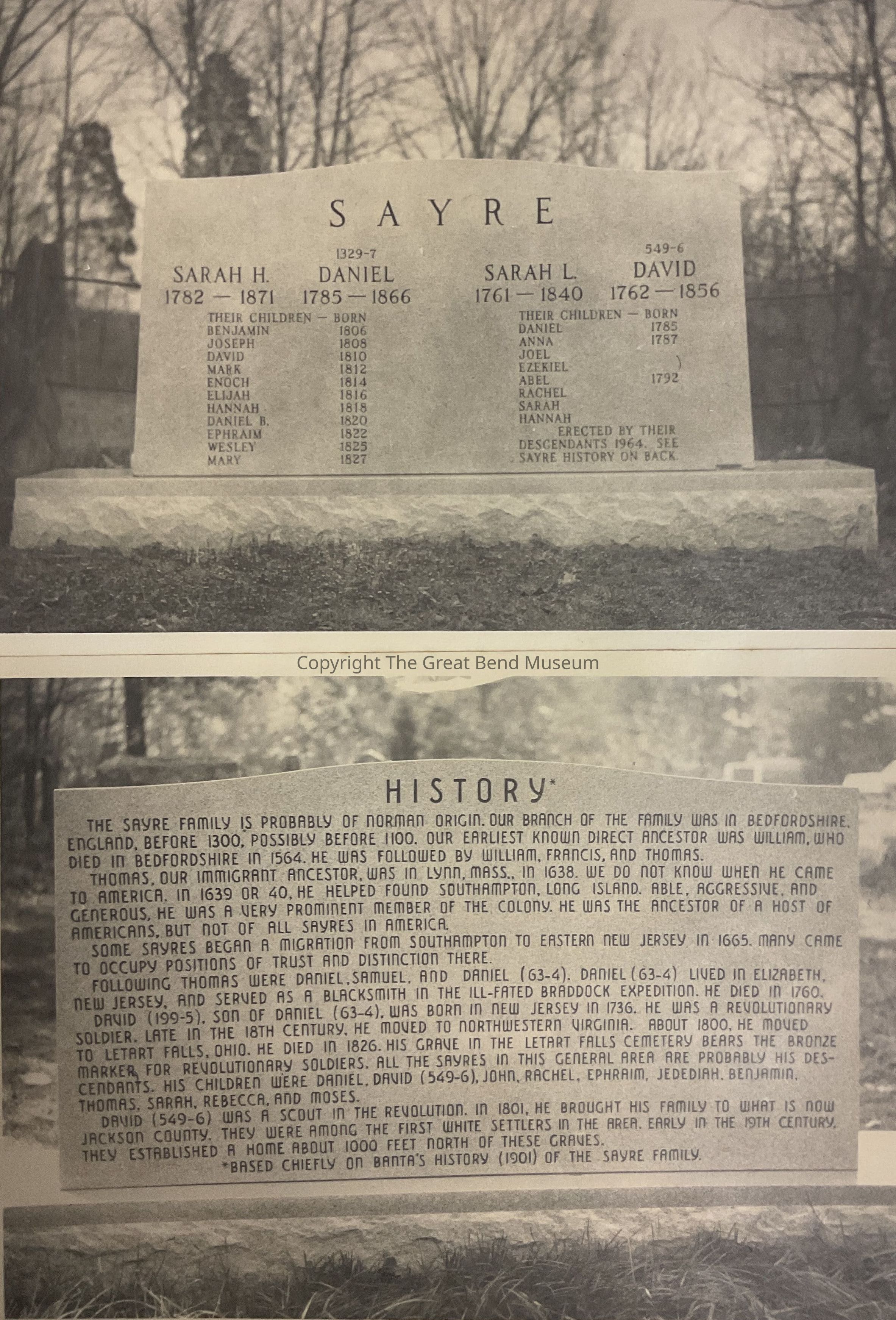 Photo of Family grave marker. Marker has parents and descendants of original Sayre family in Jackson County Has known history on back of marker. Photo is front and back taped together.Acquisition