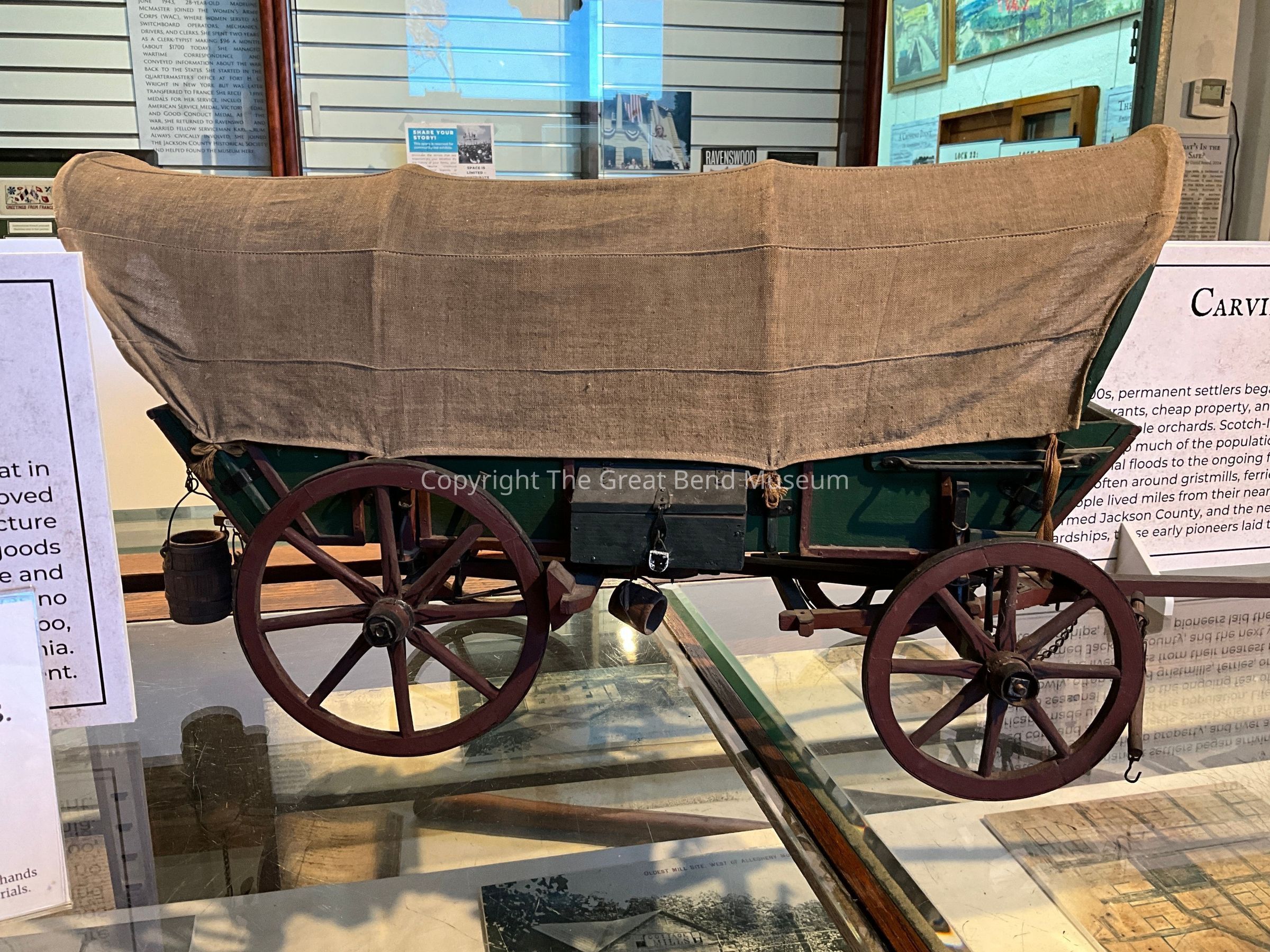 Long covered wagon, fabric cover, wooden carriage/body. Iron clad wheels. Miniature water bucket, lantern, barrel on sides, with locked storage trunk. Brakes on back wheels. Ochle trees on front (4). Bode of wagon painted green with red accents. One more bucket inside.Acquisition