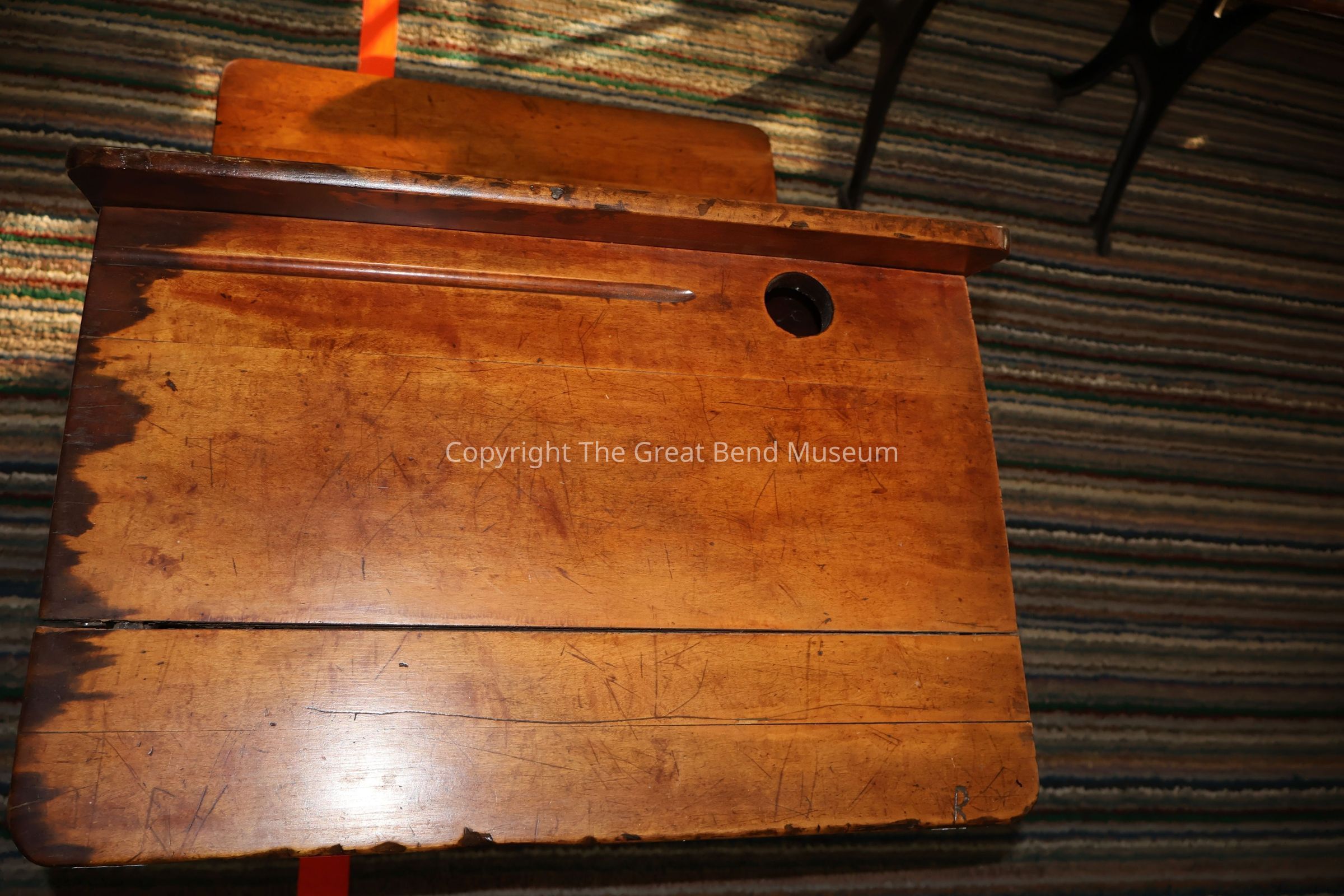 desk top is attached to back of seat in front. Seats fold up. Desktop has pencil groove, hole for ink bottle. Desktop's have cracks, scratches, engraved letters, etc. Under desktop frame is iron and is black.Acquisition