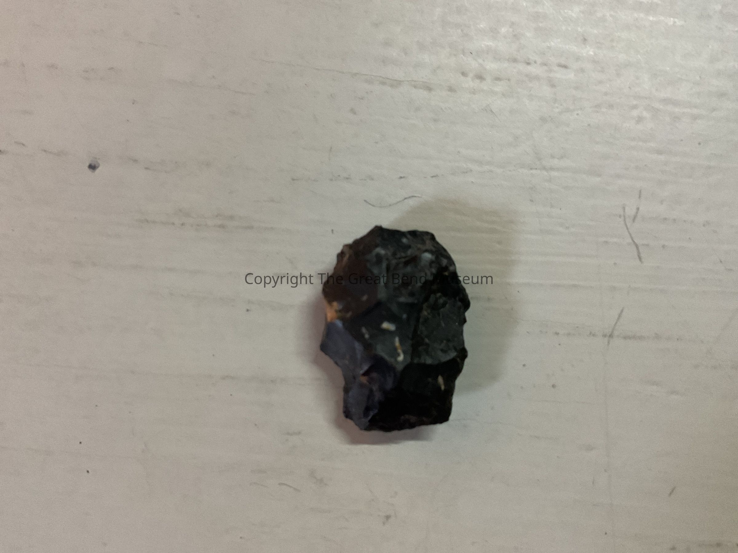 Small rounded shape very black tool. Stem has been worked, thick in the center. Possibility used as a scraper.Acquisition