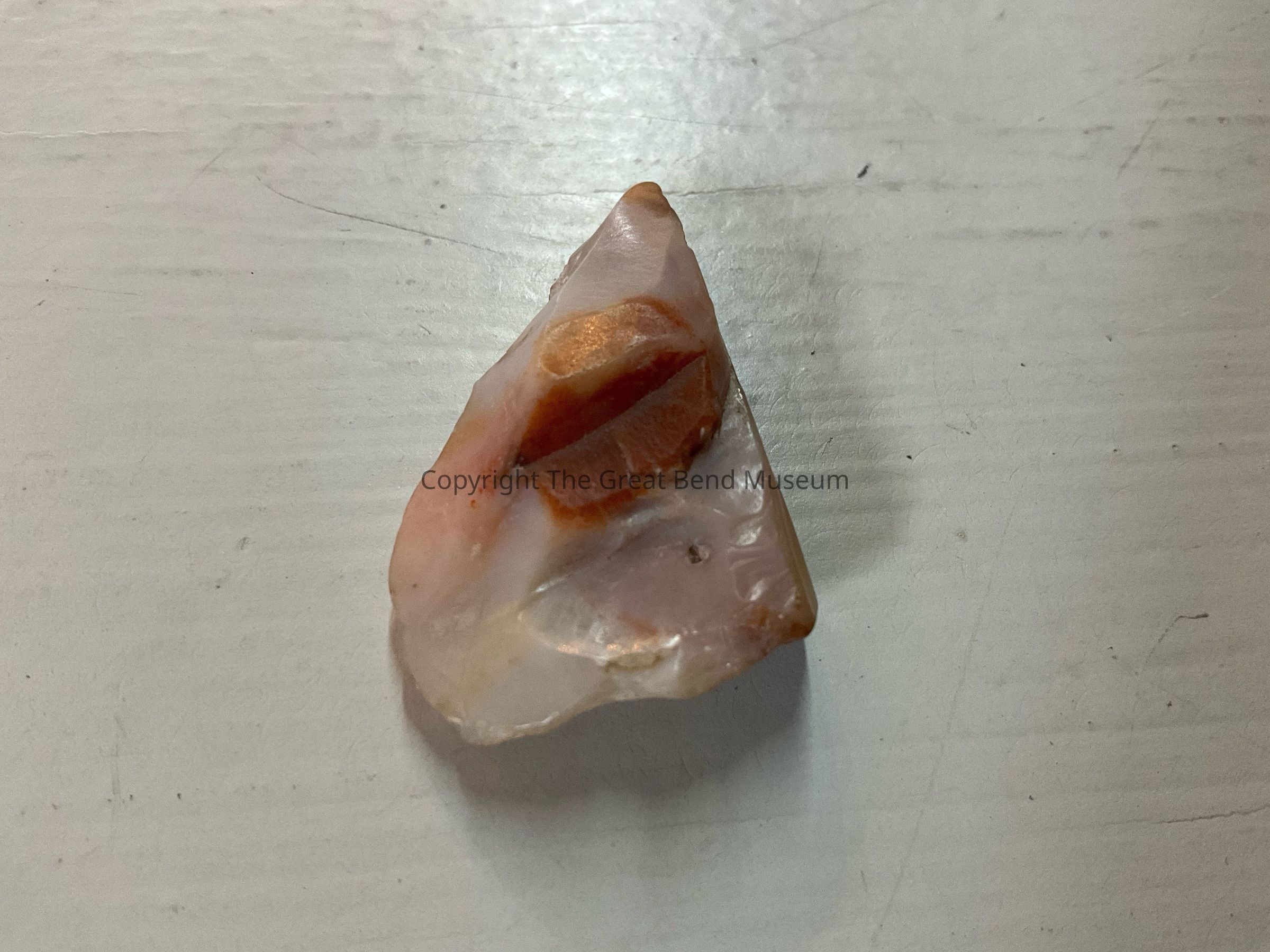 Small agate stone scraper with fluted ridge in center of pink/brown stone. Pointed on one end and rounded on the opposite end. Used for scraping hides.Acquisition