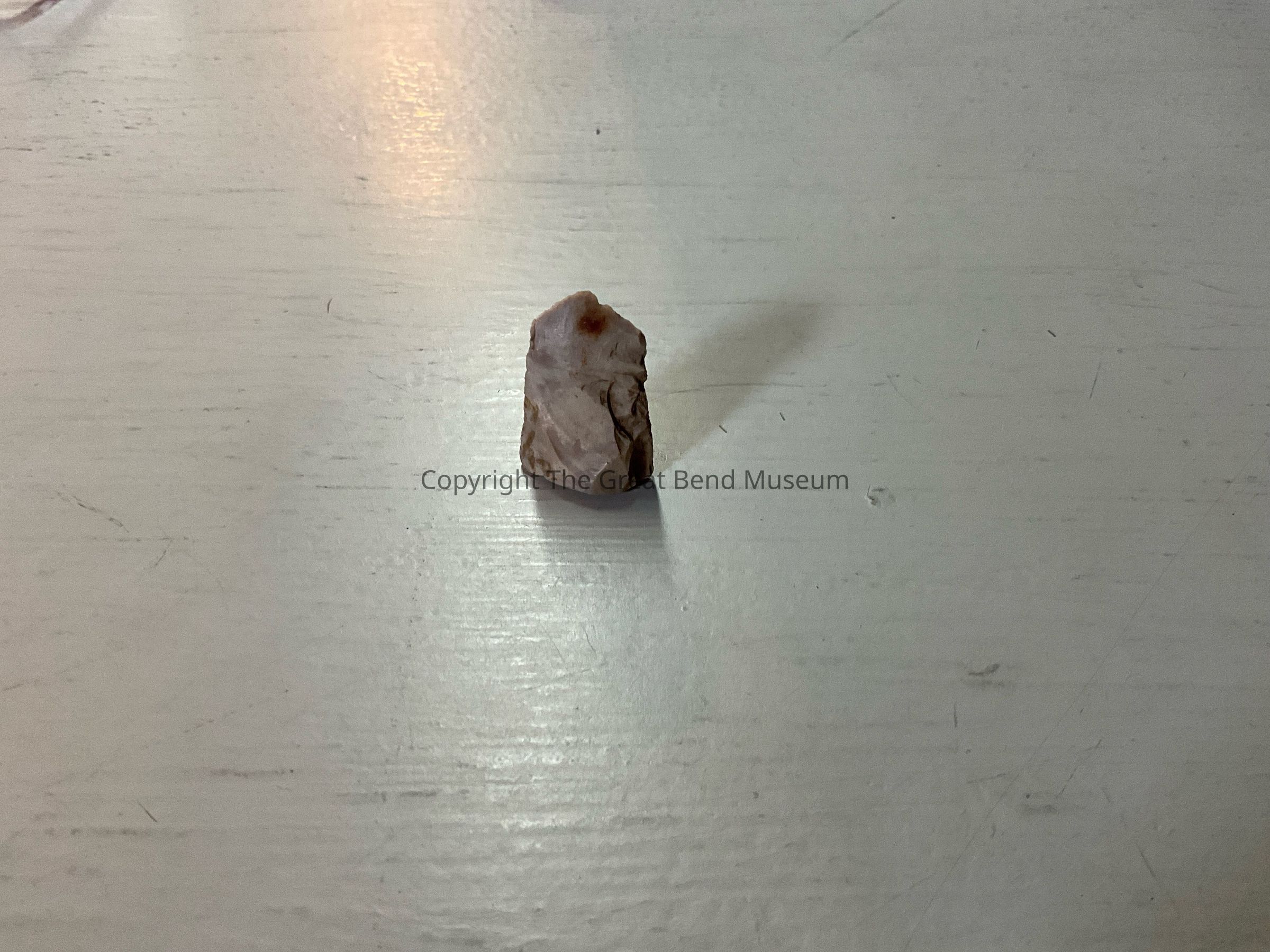 Light tan tool with flat pointed top edge and thicker flat bottom edge. Thinned in center of blade. Used for scraping hides and smoothing bone, shell and stone.Acquisition