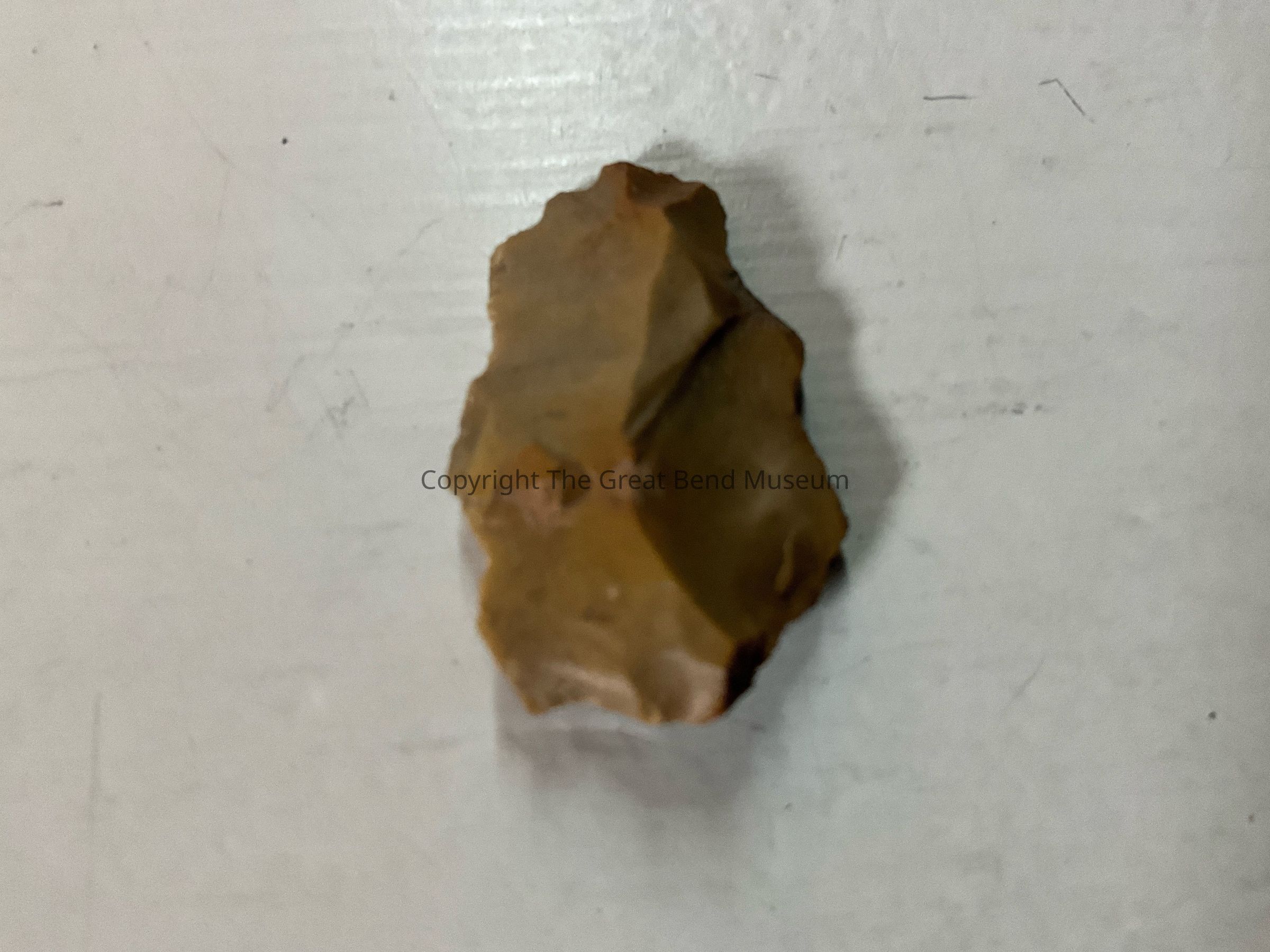 Small sharp edged tool, thin around all edges. Indentation for grip. Used for scraping hides.