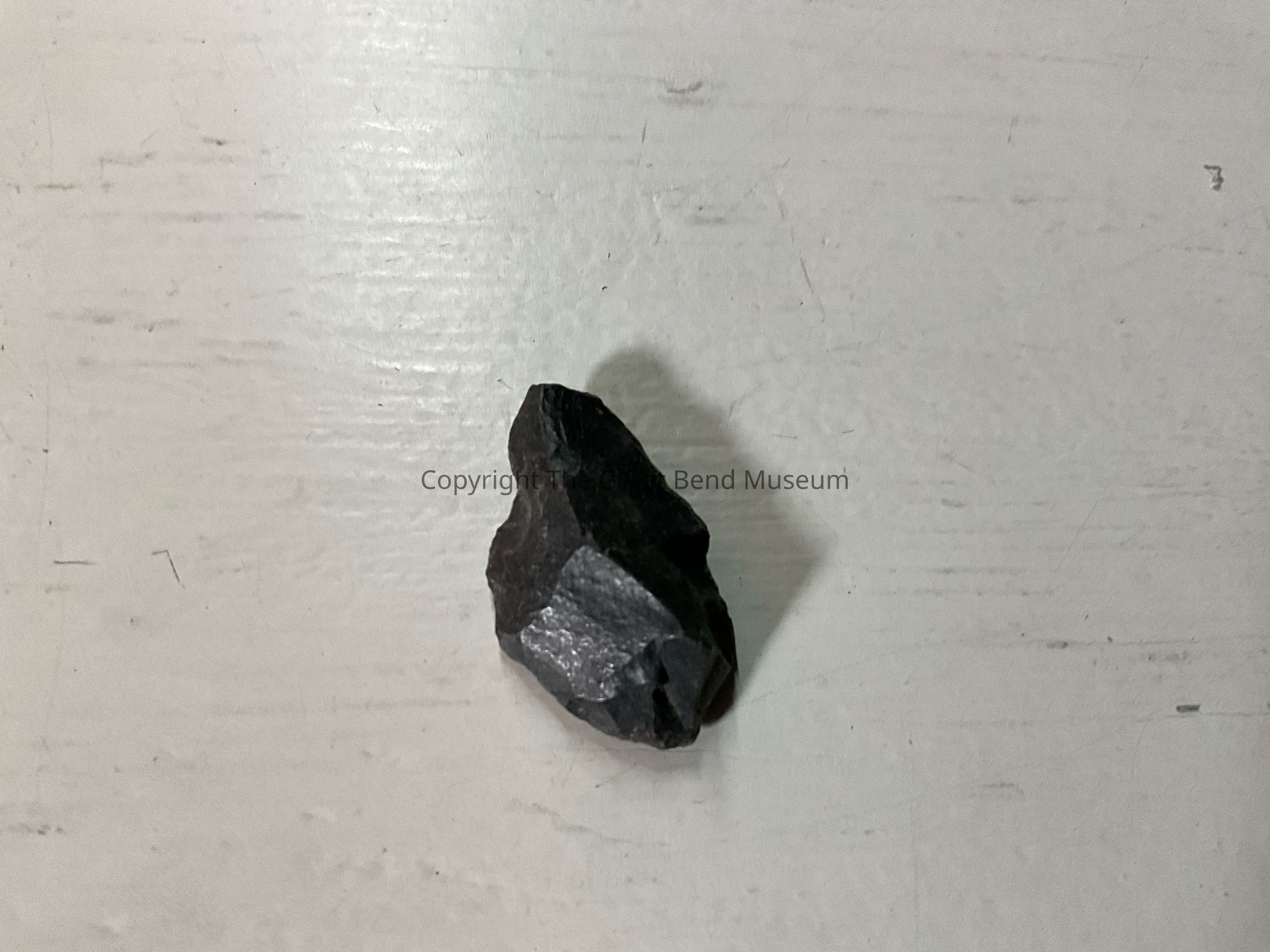 Small black round base scraper. Thicker in the middle, edges are thinned for scraping hides. Indention on back for grip.Acquisition
