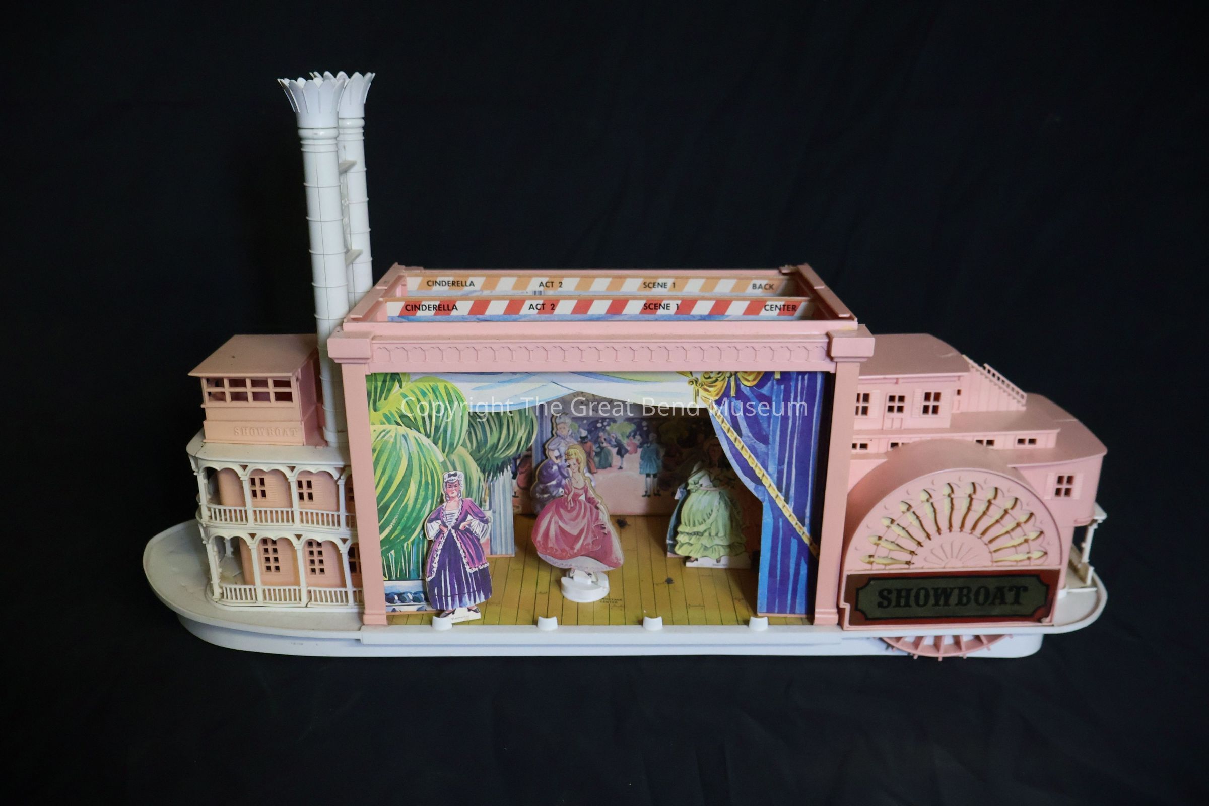 Plastic model of a show boat with a stage in center with cardboard cutouts. The boat is pink and white plastic with sticker on turn wheel that says "Showboat"