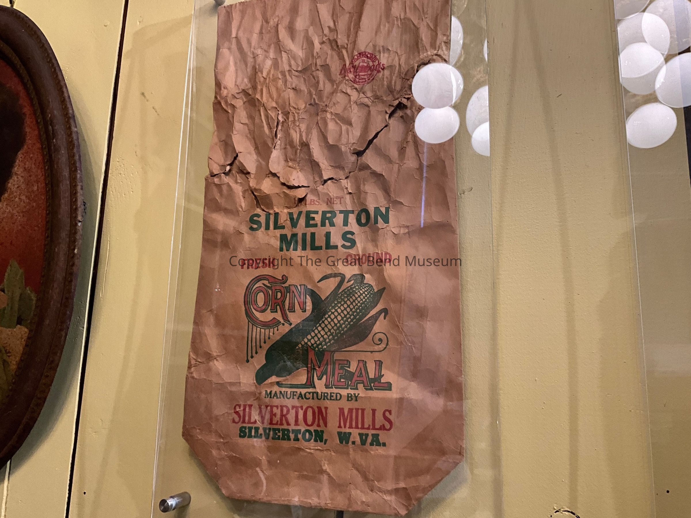 Small brown flour sack. Has written on it "Silverton Mills" "Fresh Ground Corn Meal" with a picture of an ear of corn. Manufactured by Silverton Mills. Silverton W.Va. All in Green ink, except the "Corn Meal" which is in red.Acquisition