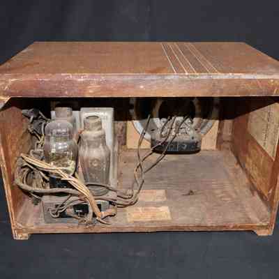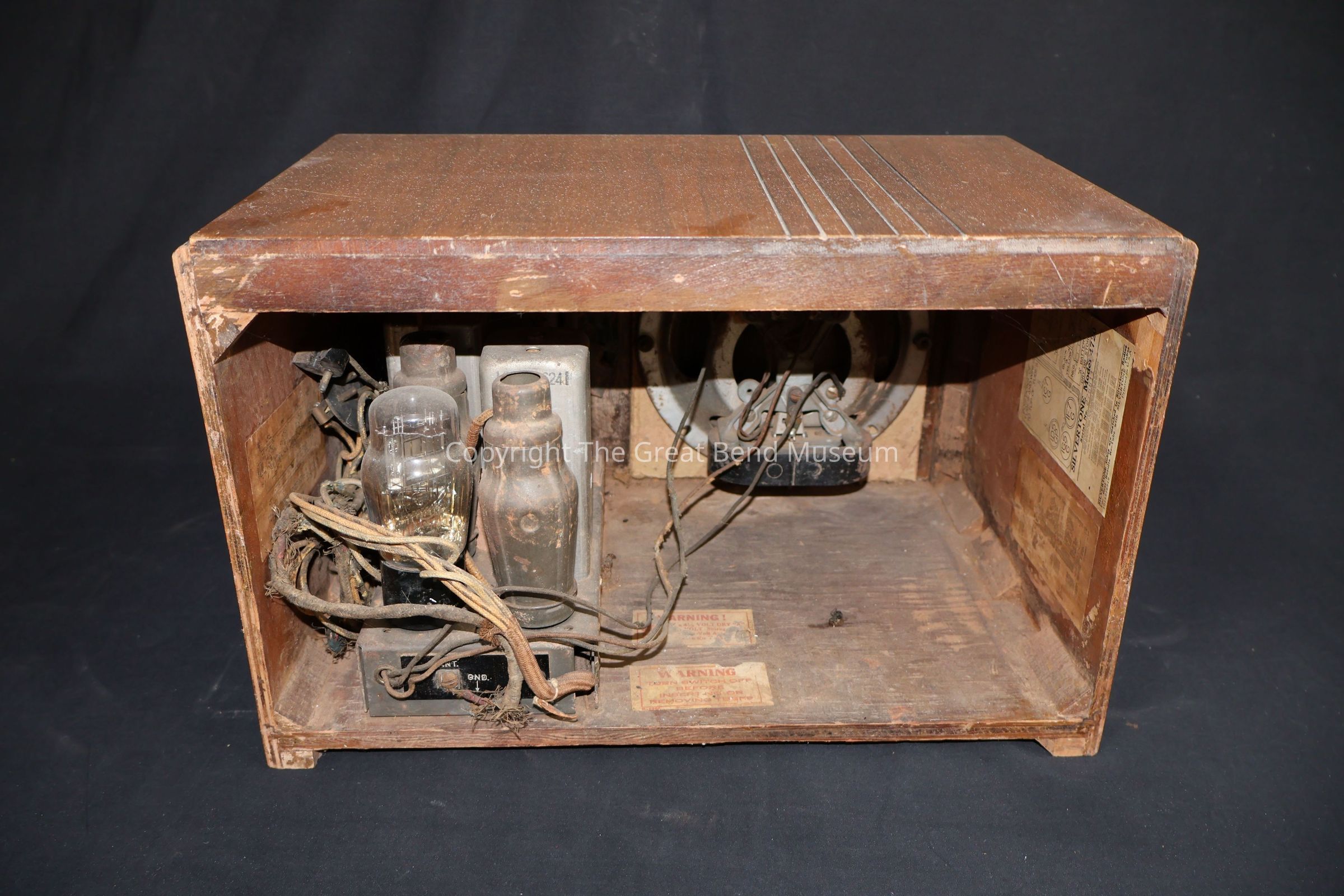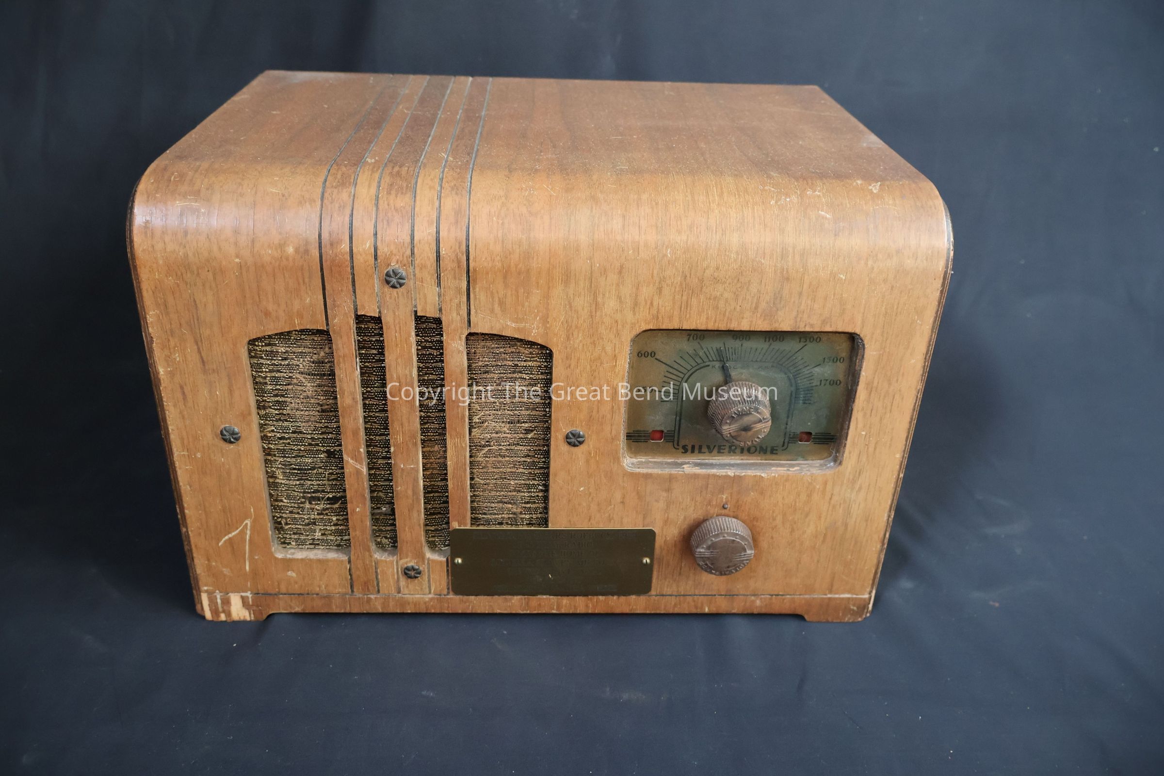 Honey colored wood with darker brown cloth covering inside speakers. Dial on front - brown. Has brass plate on front with marker - donation information. Was a battery radio. "Silvertone (Sears Roebuck) 1938 battery radio from the home of Loella Slaven Milhoan, Topins Grove WV.Acquisition