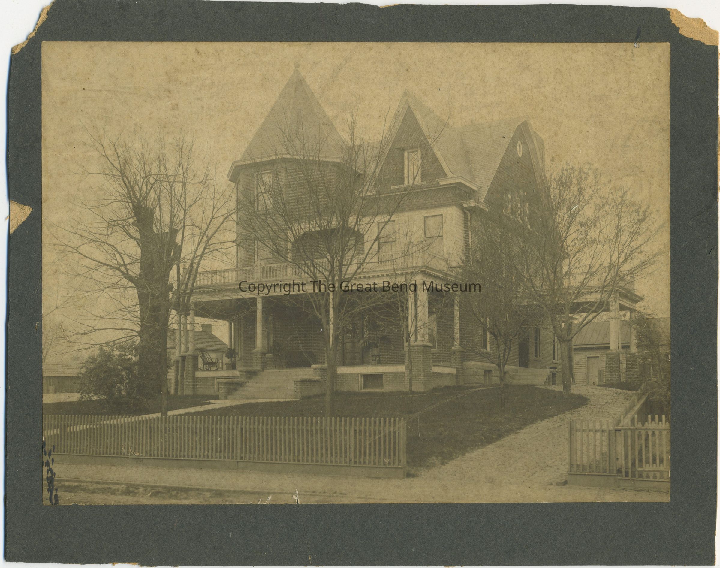 black and white photo mounted on black photo board. Fenced yard - 3 story house - large porch with rocker; 2nd story balcony + turret on 3rd floor - roofline. Driveway leads to "carriage" side entrance and carriage house in back.