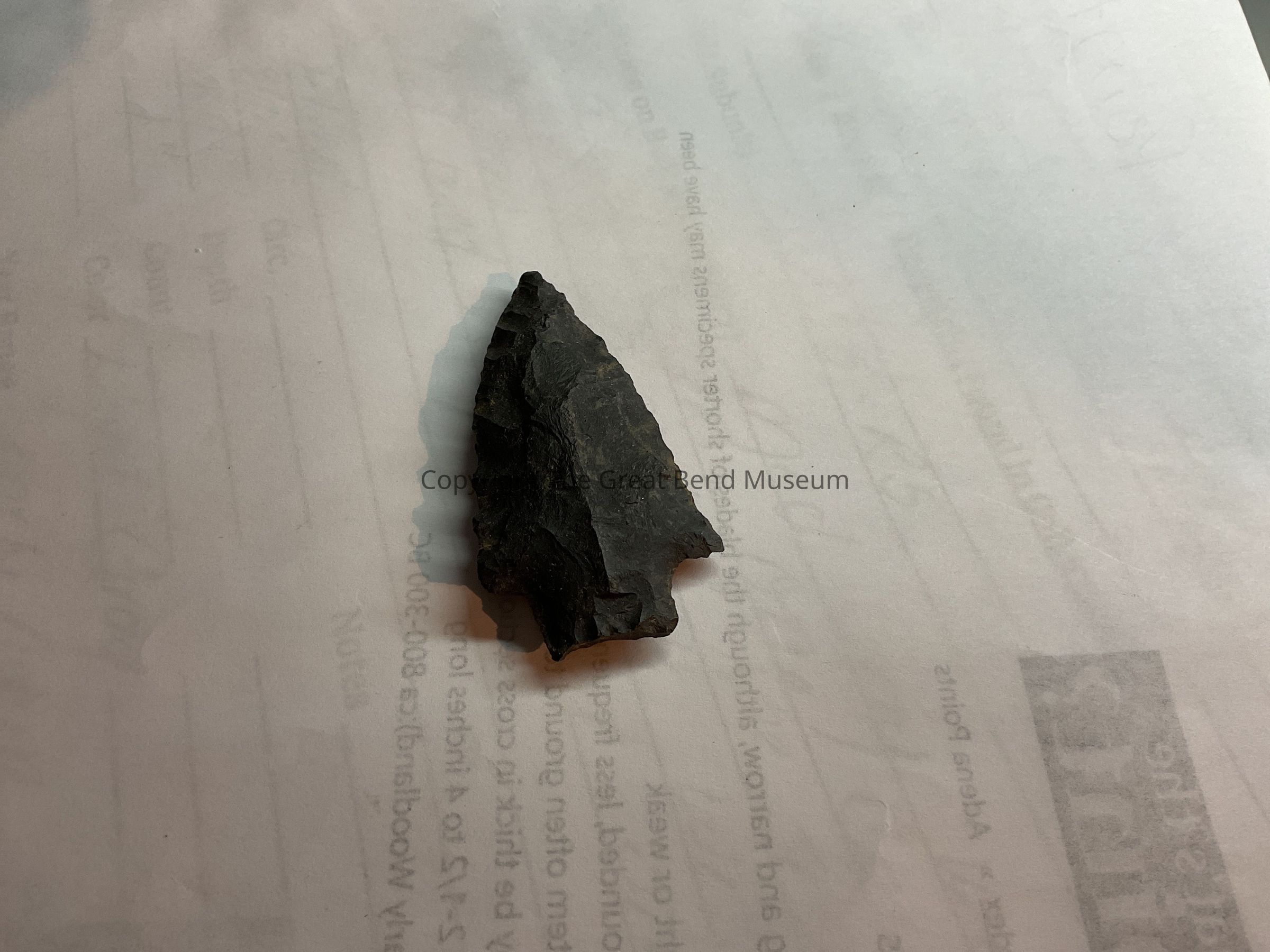 Larger dark gray point. Well defined shoulders. Sides are somewhat serrated due to resharpening. Stem is straight on sides and basal edge, slightly concave. There is prominent ridge in center.Made/Created