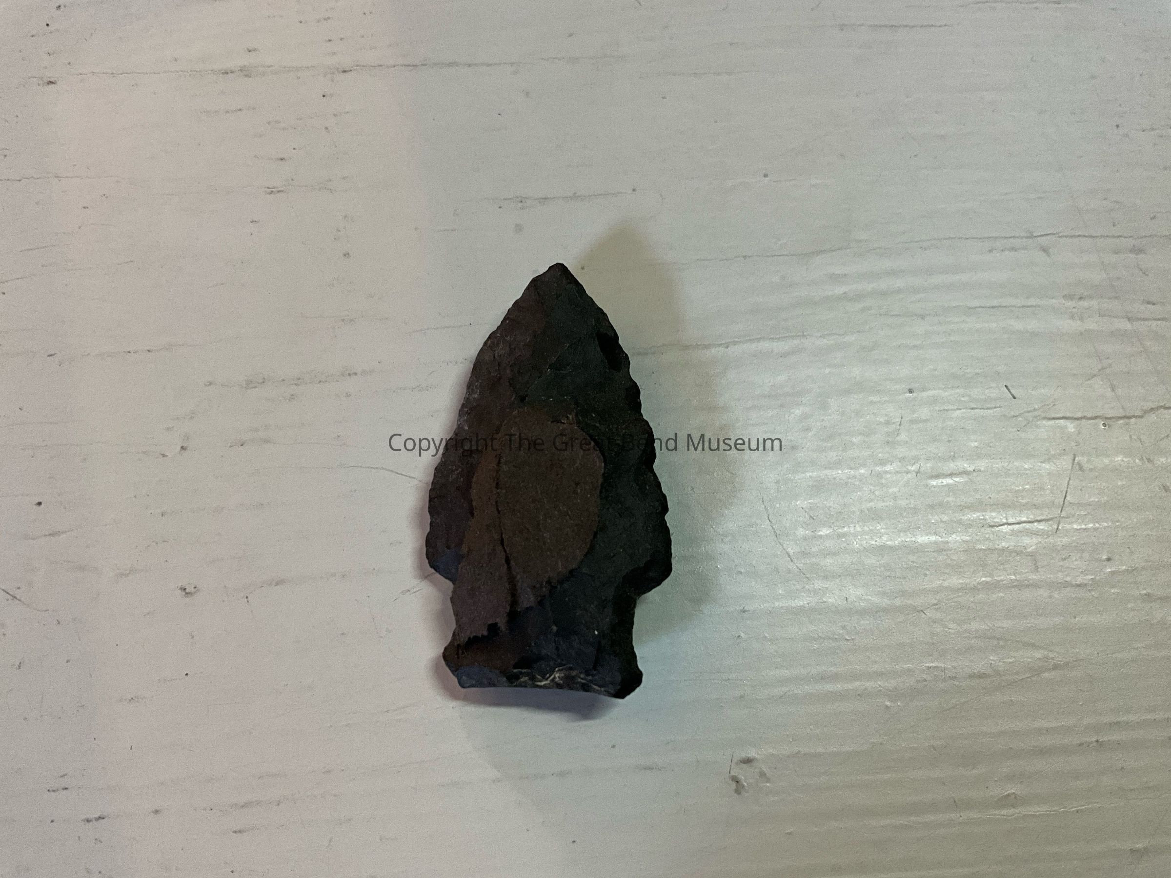 Black triangular shaped blade with narrow shoulders. Stem ihas slightly flared basal edge. Stem has straight sides. Point is thicker in the middle.Acquisition