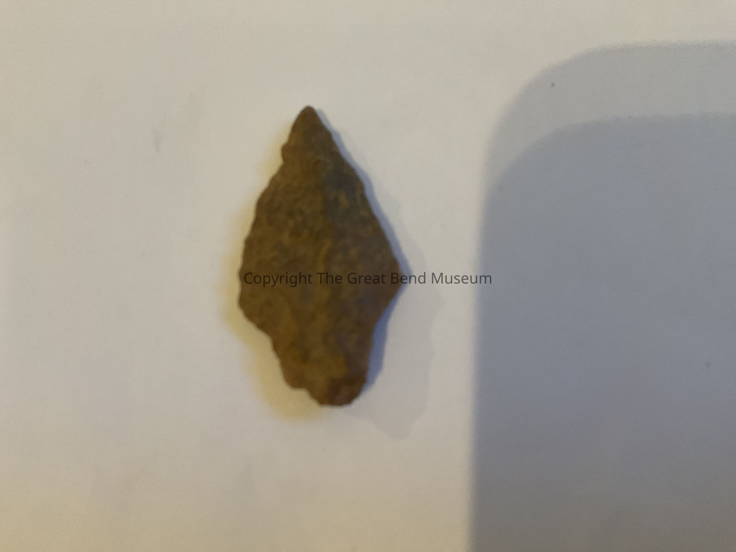 Small thin light Brown blade. Triangular shaped with prominent stem. Weak shoulders and sharp point. Stem is rounded with a chip on one side. Stem has not been thinned. Edges serrated from resharpening.Acquisition