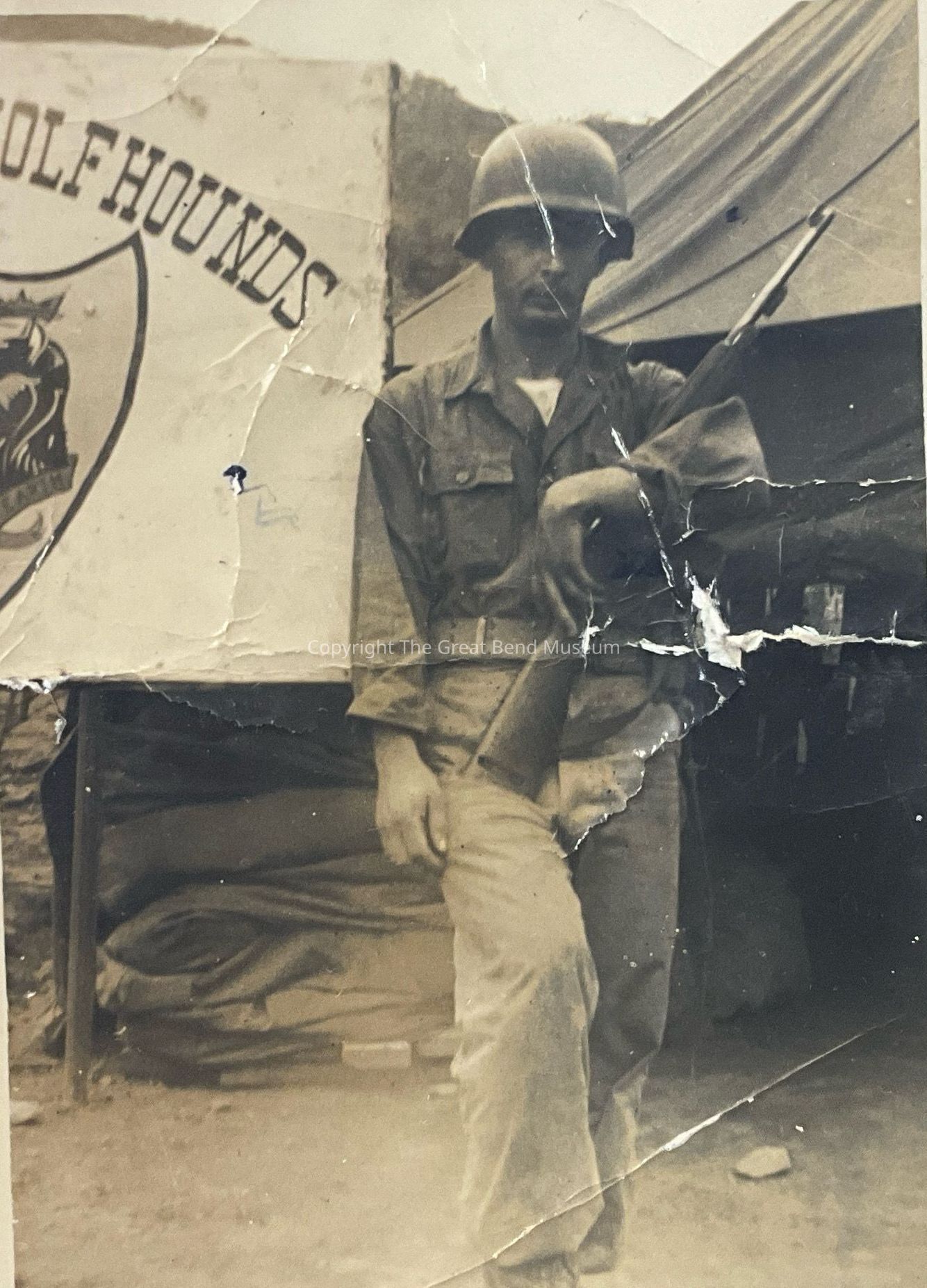Photo of Soldier holding rifle, wearing uniform and helmet, standing in front of tent, Partial words on sign “Wolf Hounds”— Written on back “West of Punch Bowl—2nd time in line—3rd area since (entering company)—Last of July 52.”Acquisition