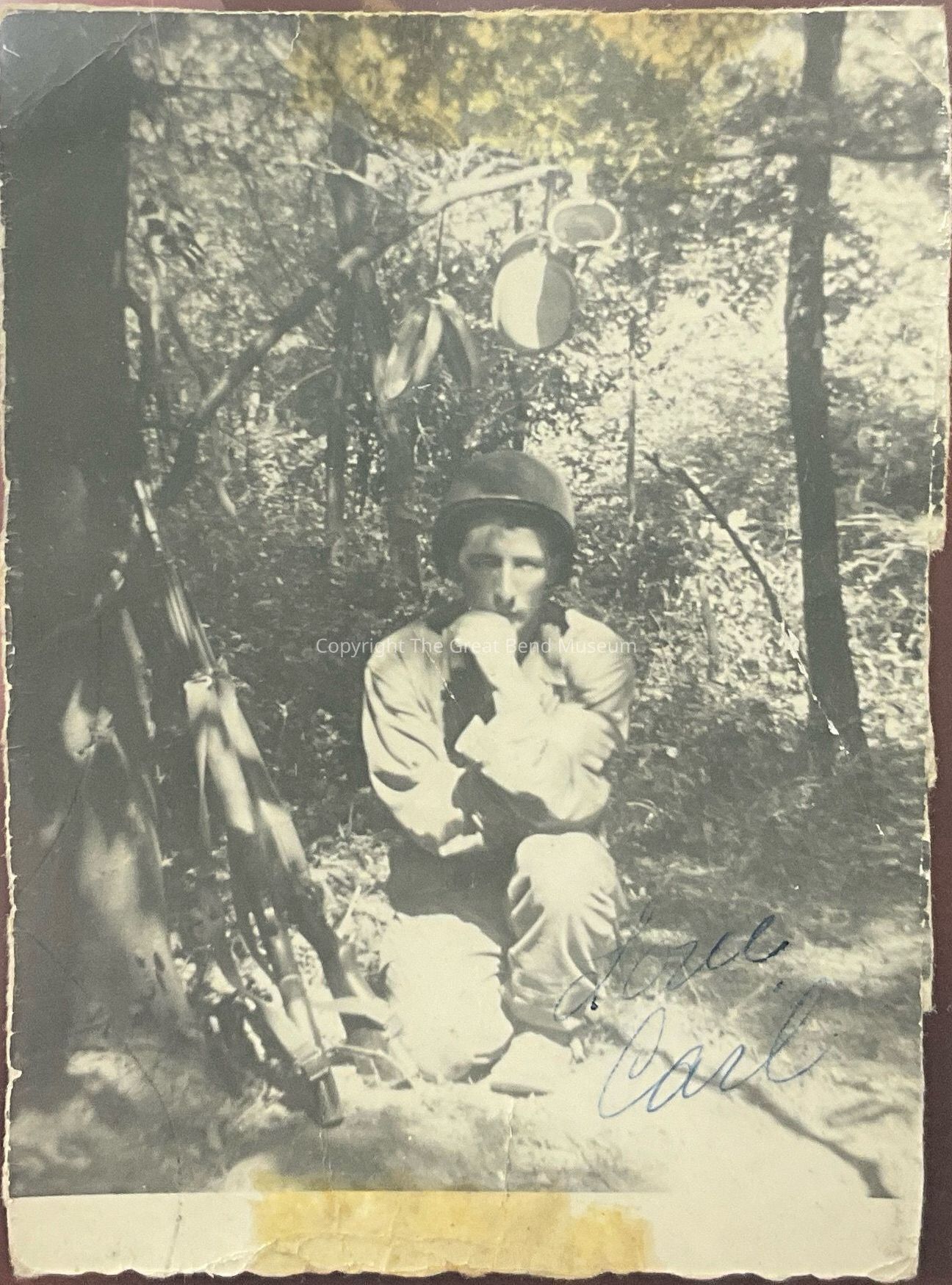 Soldier kneeling in woods. Written on back “C.W. Pignato, Comp Breckinridge” “August” “Jungl Flights” Written on front “Love Carl”.Acquisition