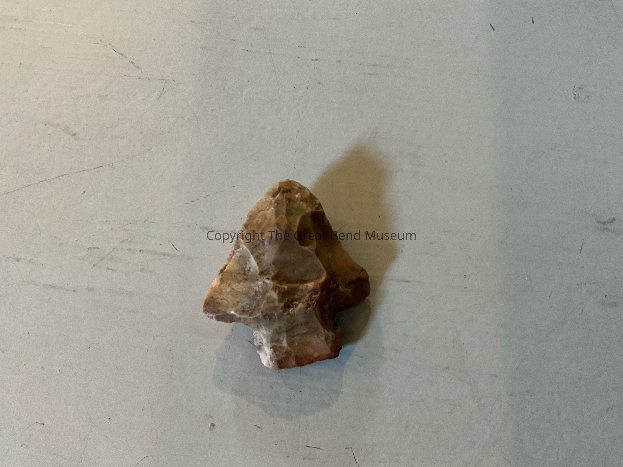 Broad light brown arrowhead. Shoulders are broad with straight sided stem. Basal edge is straight and worked on both sides. Thicker in the middle of blade. Looks to have some Red Jasper in the stem.Acquisition