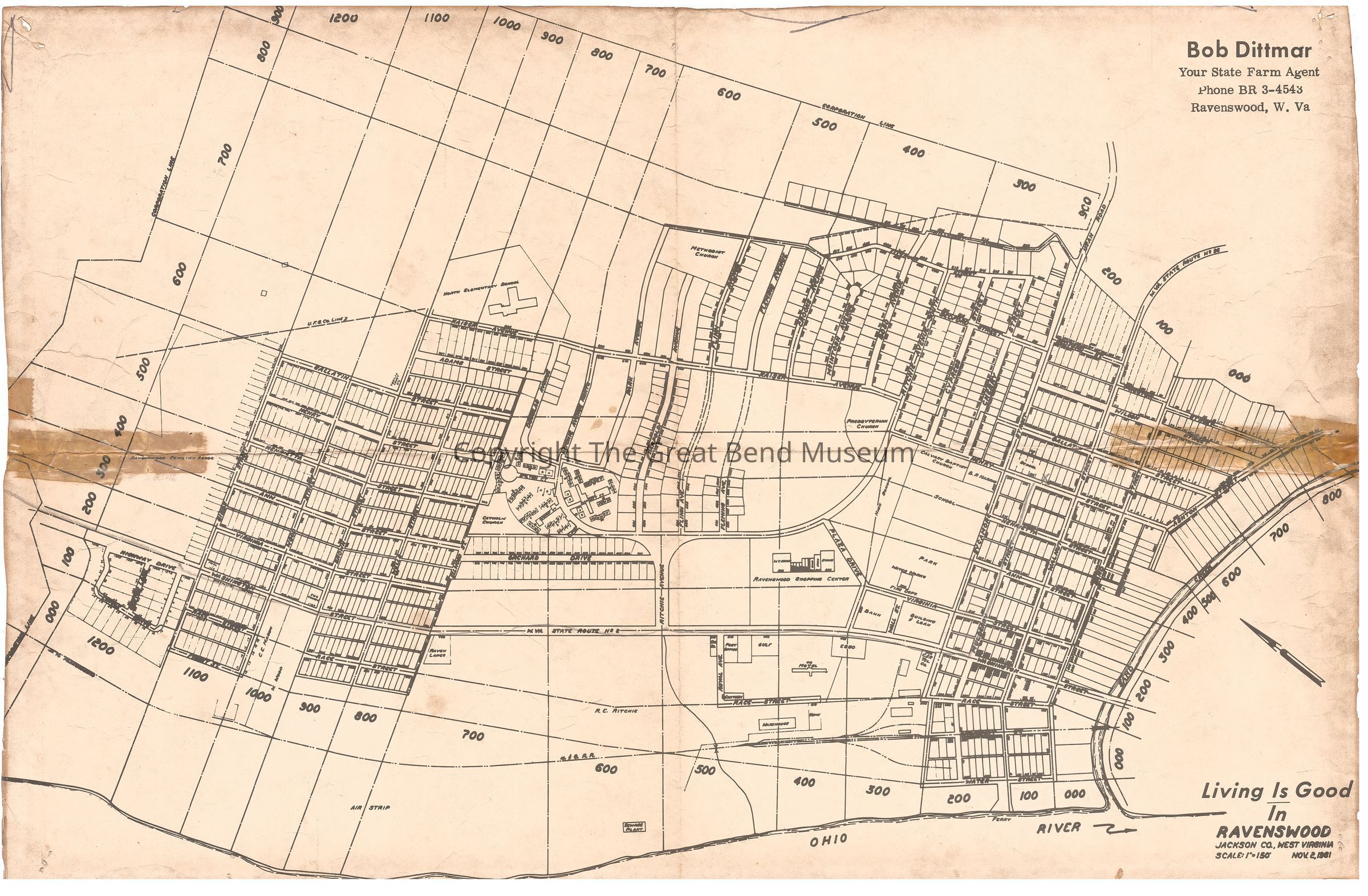 Front: Top right corner. Bob Dittmar, your State Farm Agent, Phone BR 3 - 4543, Ravenswood, W.Va.; Bottom Right corner - Living is Good In Ravenswood, Jackson Co. West Virgina, Scale: 1"=150' November 2, 1961.Acquisition