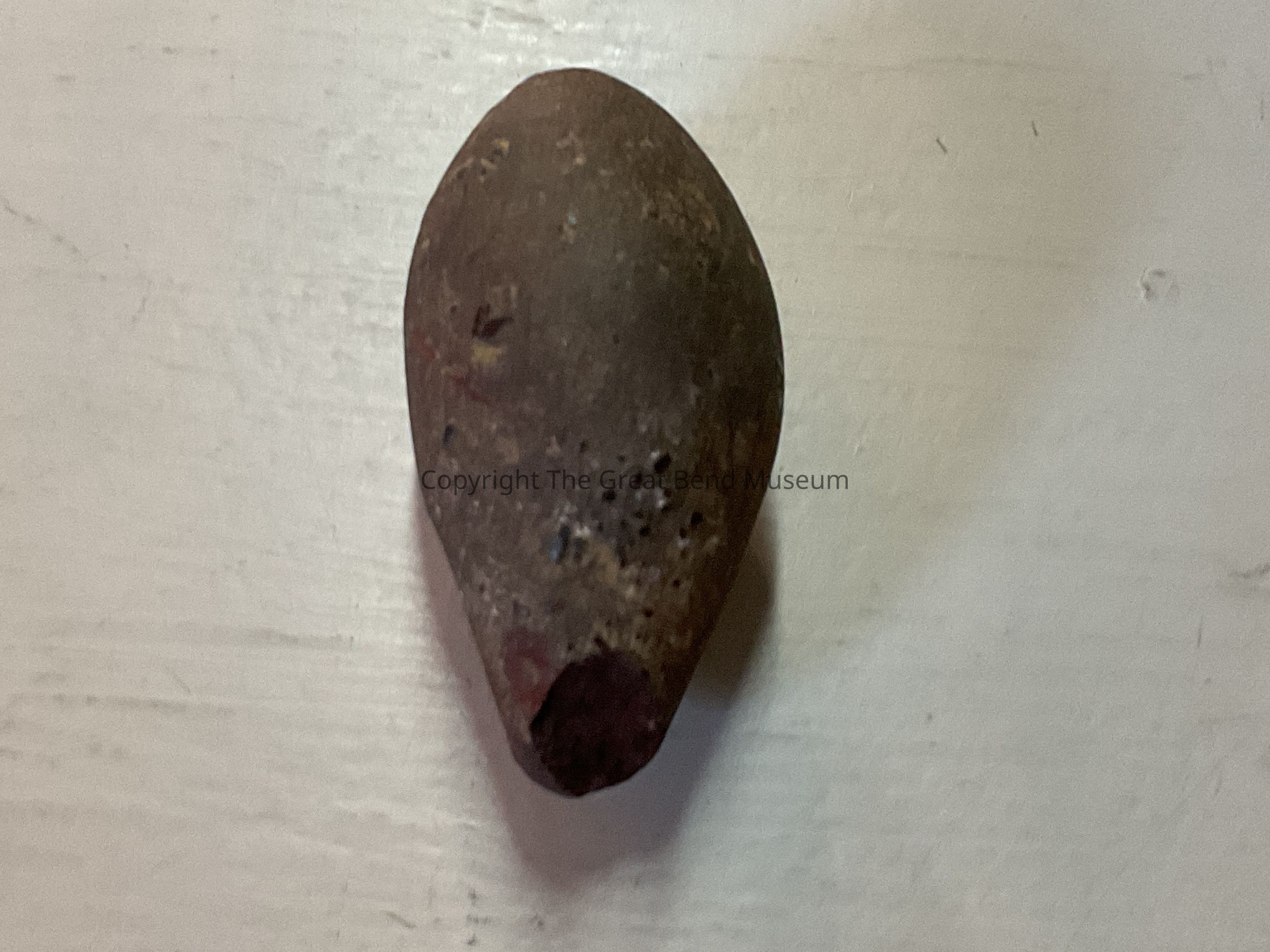 Smoothed medium sized oval shaped stone. End comes to a point with a flattened edge on one side. A plummet was often used as a weight for fishing nets.Acquisition