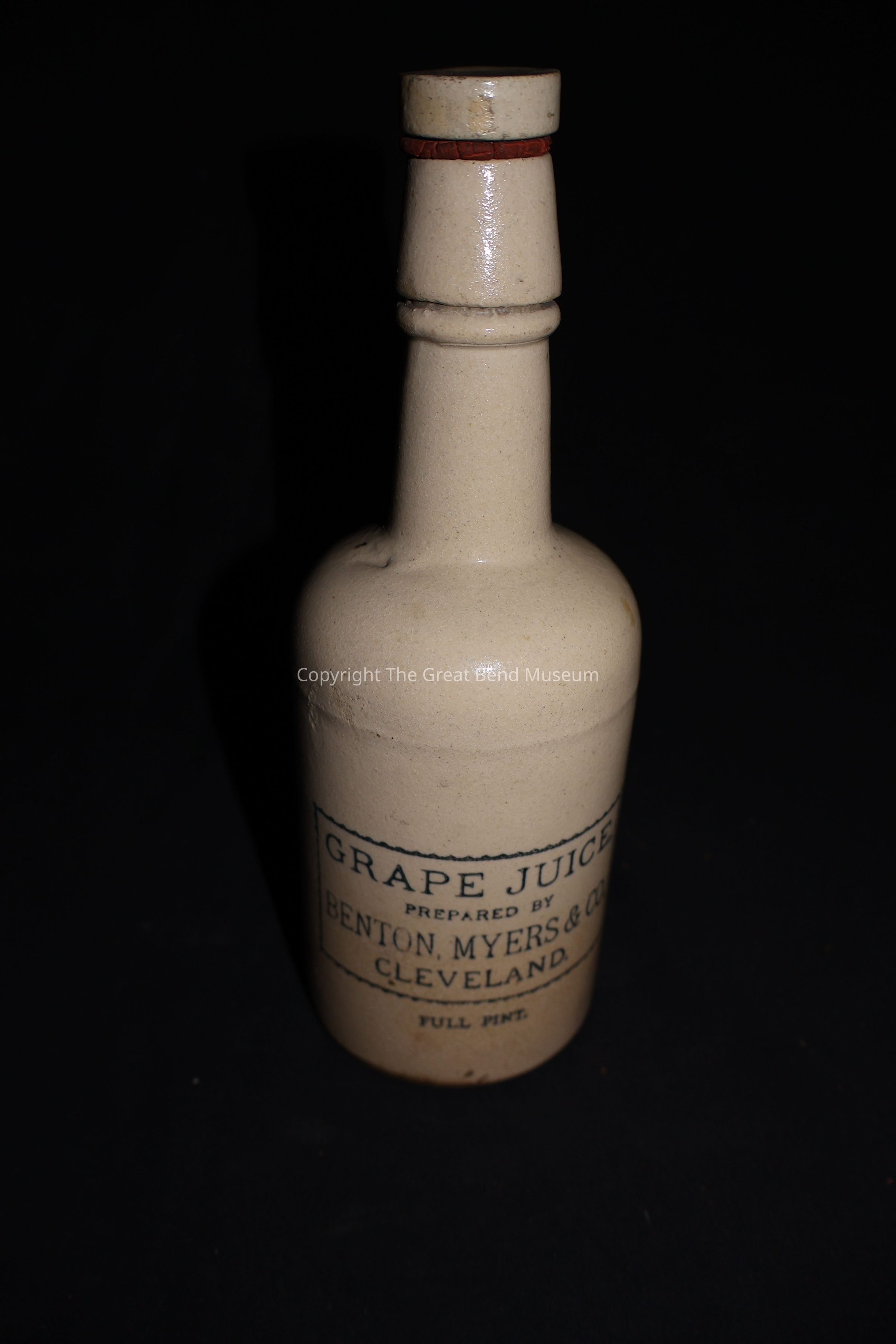 Tall, beige bottle, company name listed on front, design indentions in bottle handle, the cork has a rubber seal, amount of juice is listed on bottle front under the stamped company name of type of juice. (full pint) Stamp has a blue hue, 108 in black marker on the bottom.Acquisition