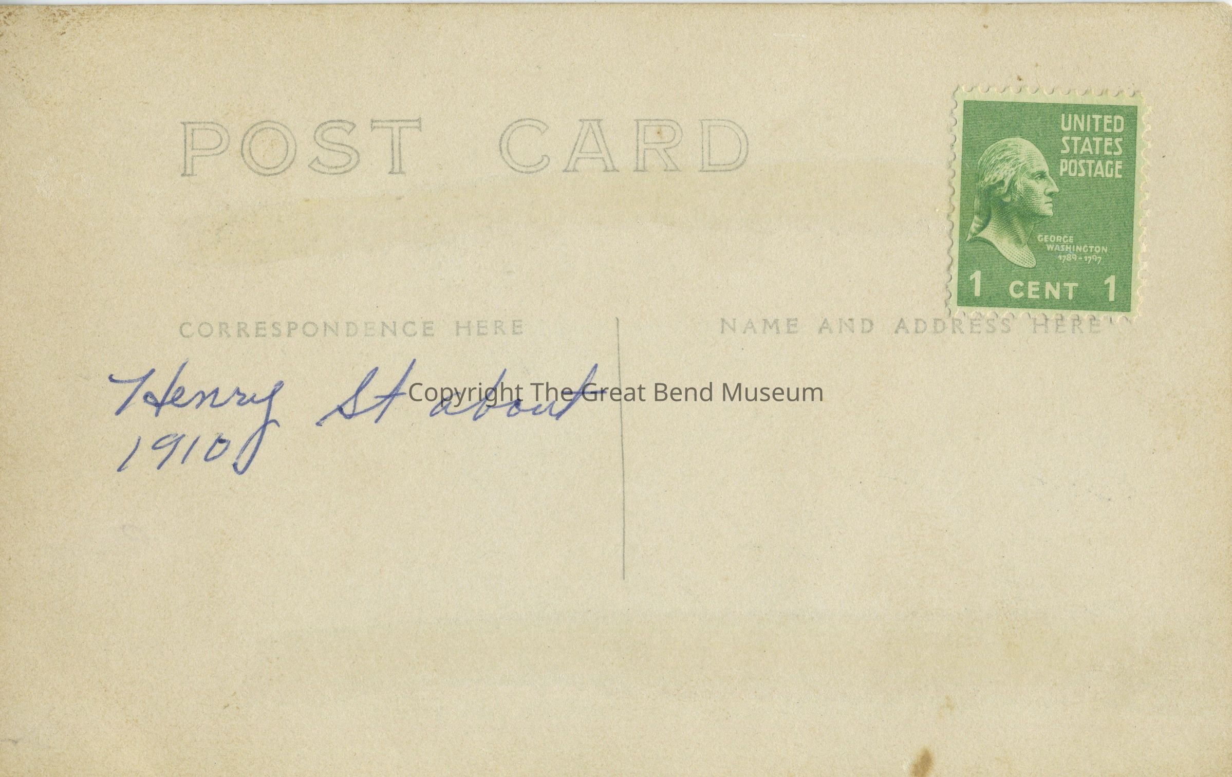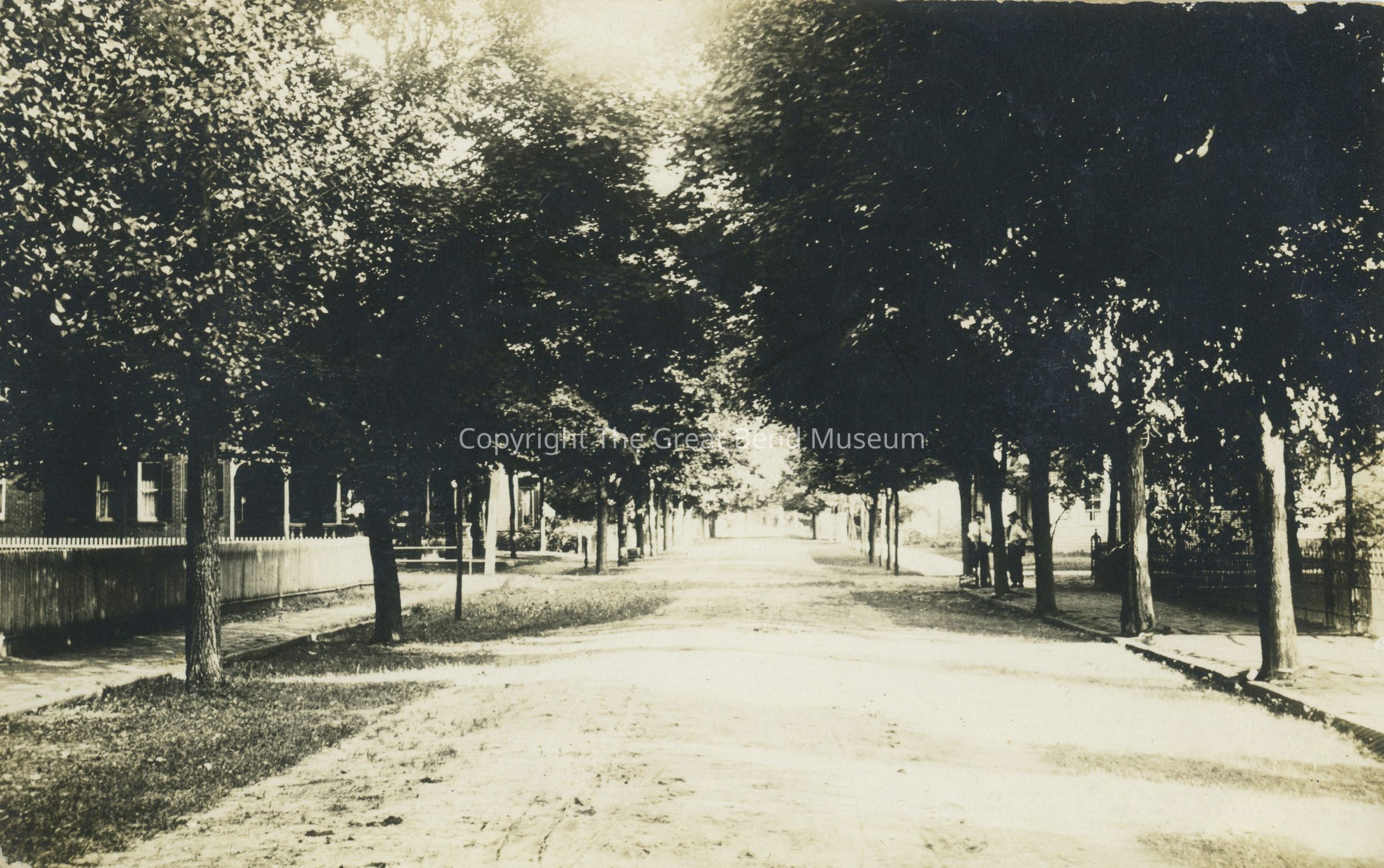 B/W (sepia) picture postcard tree lined street in summer. Stand postcard details on back; not used but stamped; 2 men standing on center right under trees; white shirts, dark hats, ties and pants, unpaved street. On back - Henry Street about 1910. 1 cent green postage stamp - George Washington, United States