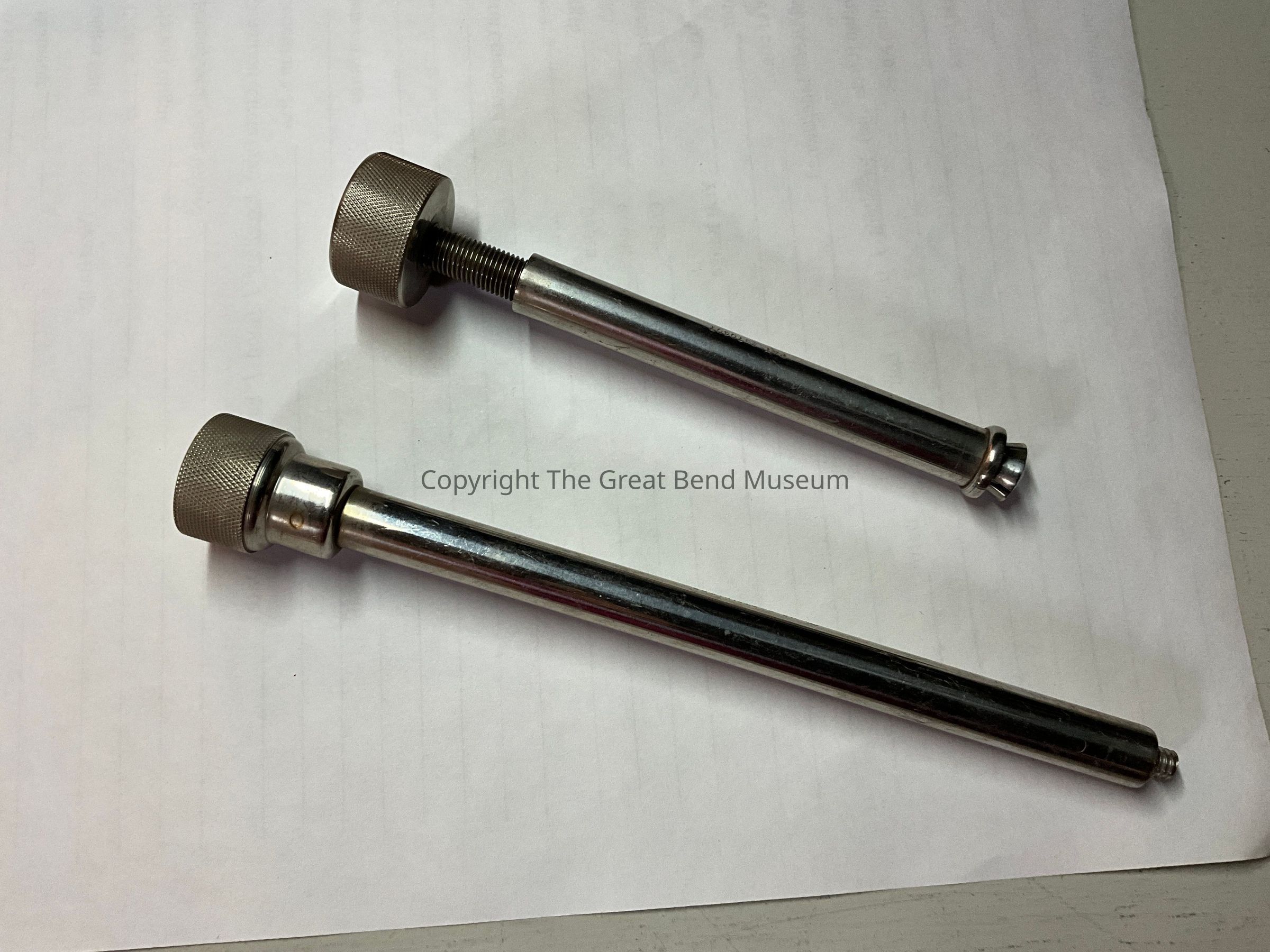 2 pieces of rounded stainless steel rods used for extensions on surgical instruments. They have large adjustment screws at the top of the cylinder. They have patent numbers etched in the center of the rod. 8 inch rod also has “Stainless” etched in center. Screws are etched metal for better grip. Both have center screw that slides Up and down for fit.Acquisition