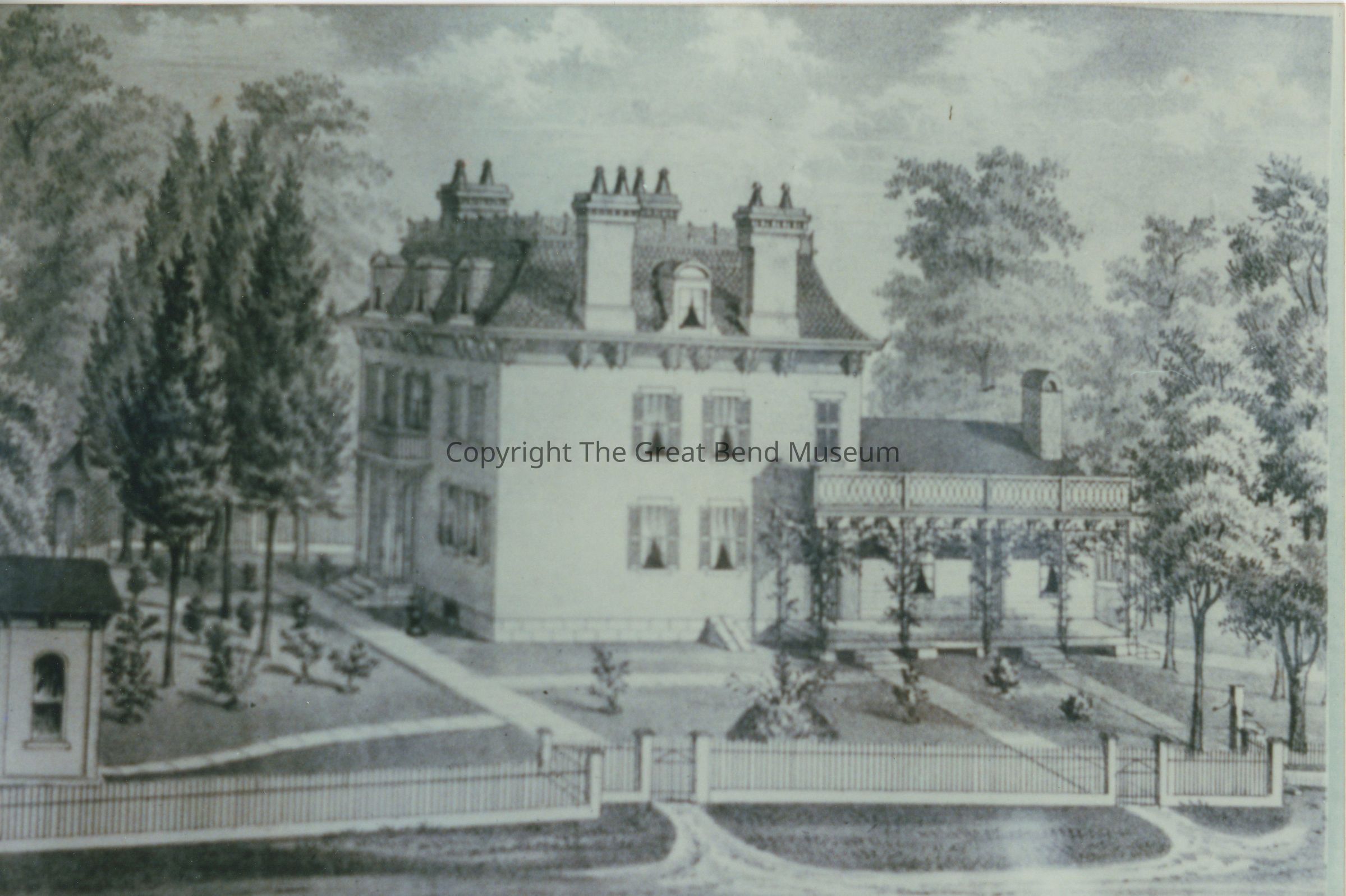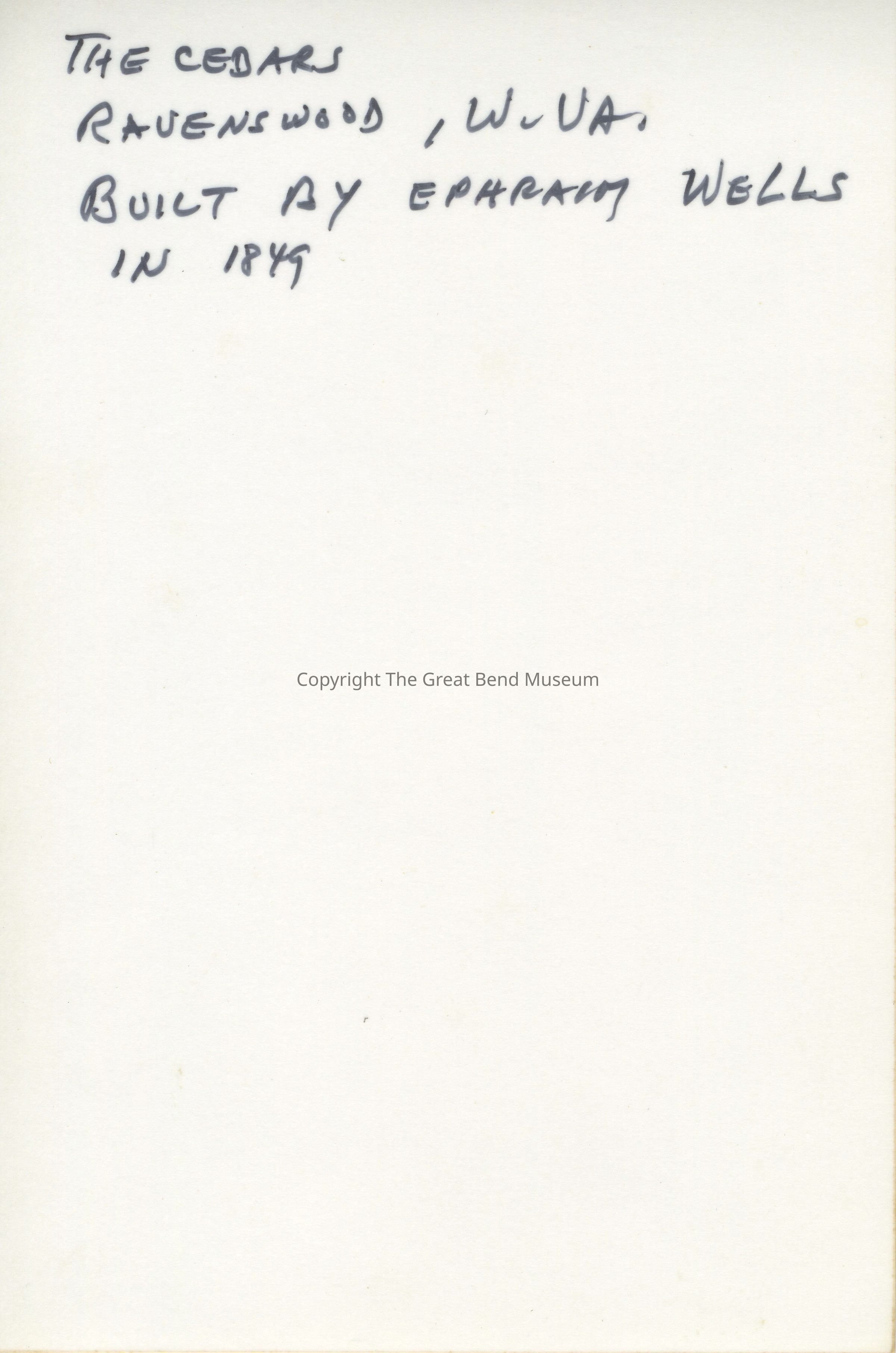 Black and white photocopy of an etching - stately house with a fenced entrance surrounded by cedar trees. On the back "The Cedars; Ravenswood, W.Va.; Built by Ephraim Wells in 1849"Acquisition