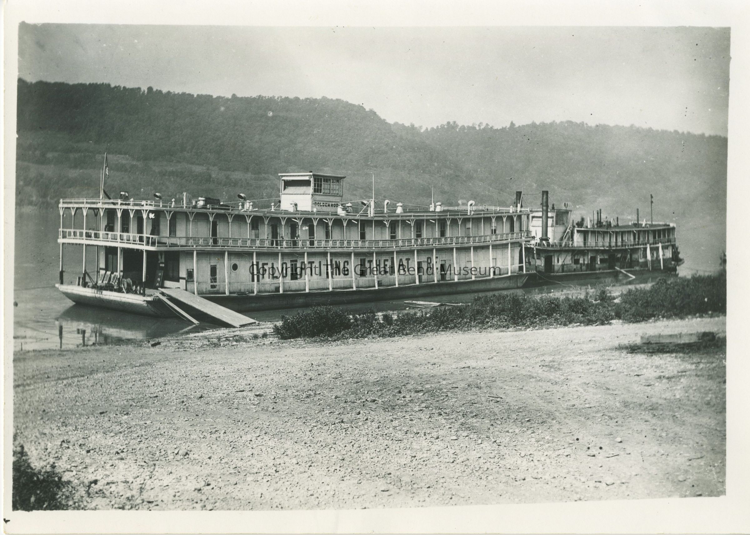 It is a photo of "The Goldenrod Floating Theater" at dock. It is being towed by Crown Hill. There is a clear image. No passengers are present. "Floating Theater" is written large on the side of the boat. 105%, 8 X 28 penciled on the back. 16 / 171 is penned in red ink, the title of the photo is penciled at the bottom. It is mounted with 2020.05.01-04Acquisition