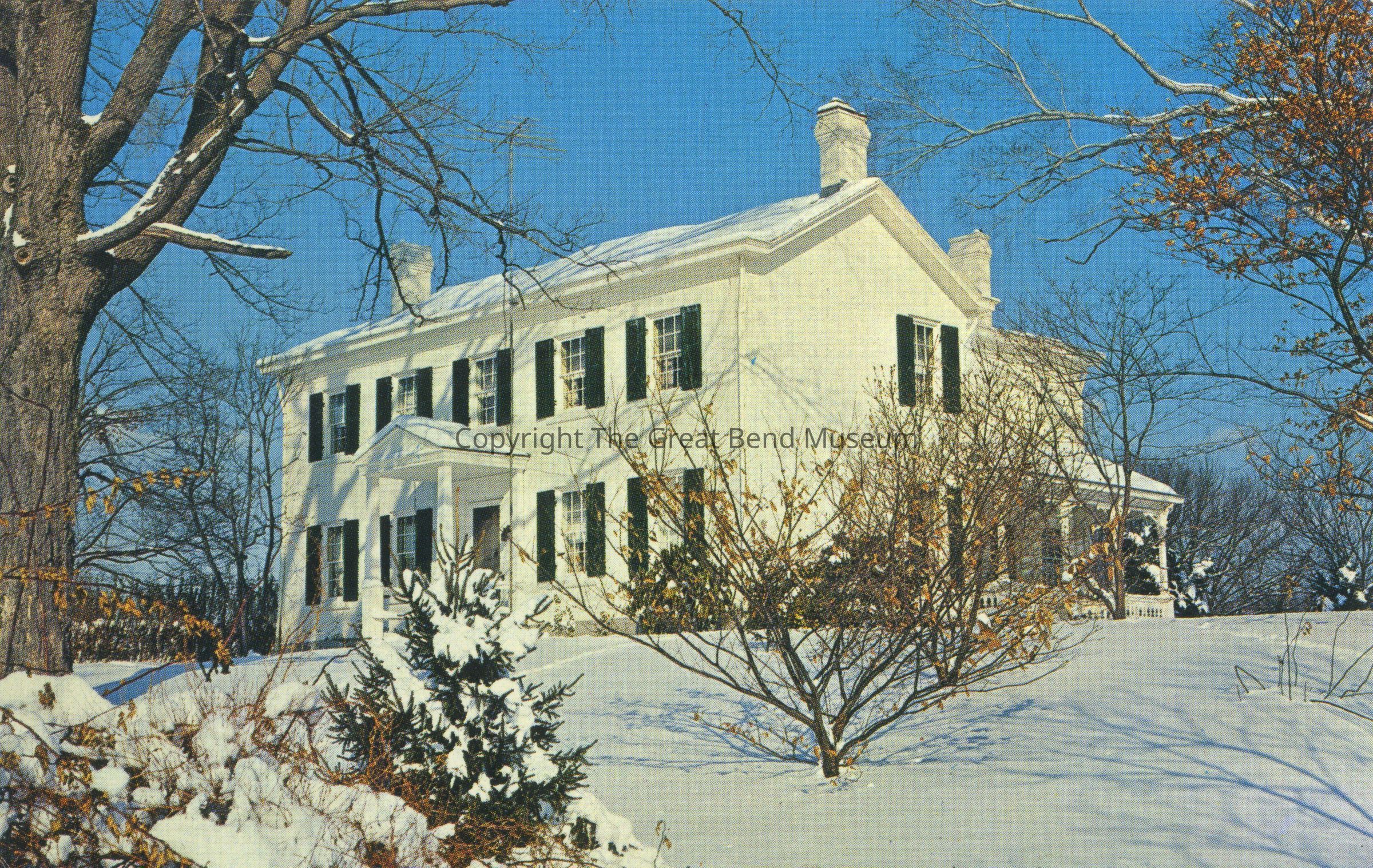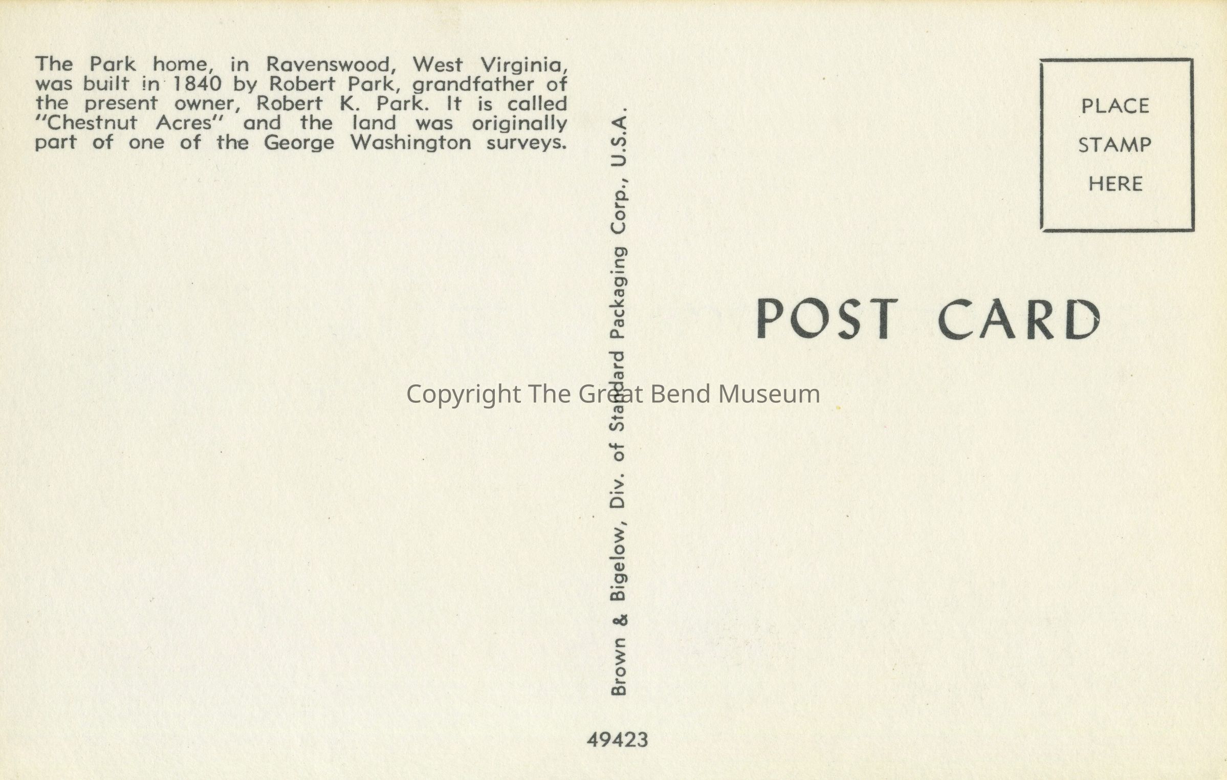 color photo postcard of stately white house in winter - snow covered lawn. Back: The Park home, in Ravenswood, West Virginia, was built in 1840 by Robert Park, grandfather of the present owner, Robert K. Park. It is called "Chestnut Acres" and the land was originally part of one of the George Washington surveys.Acquisition