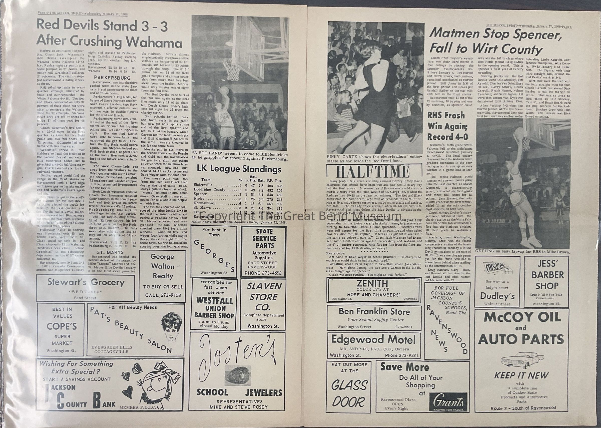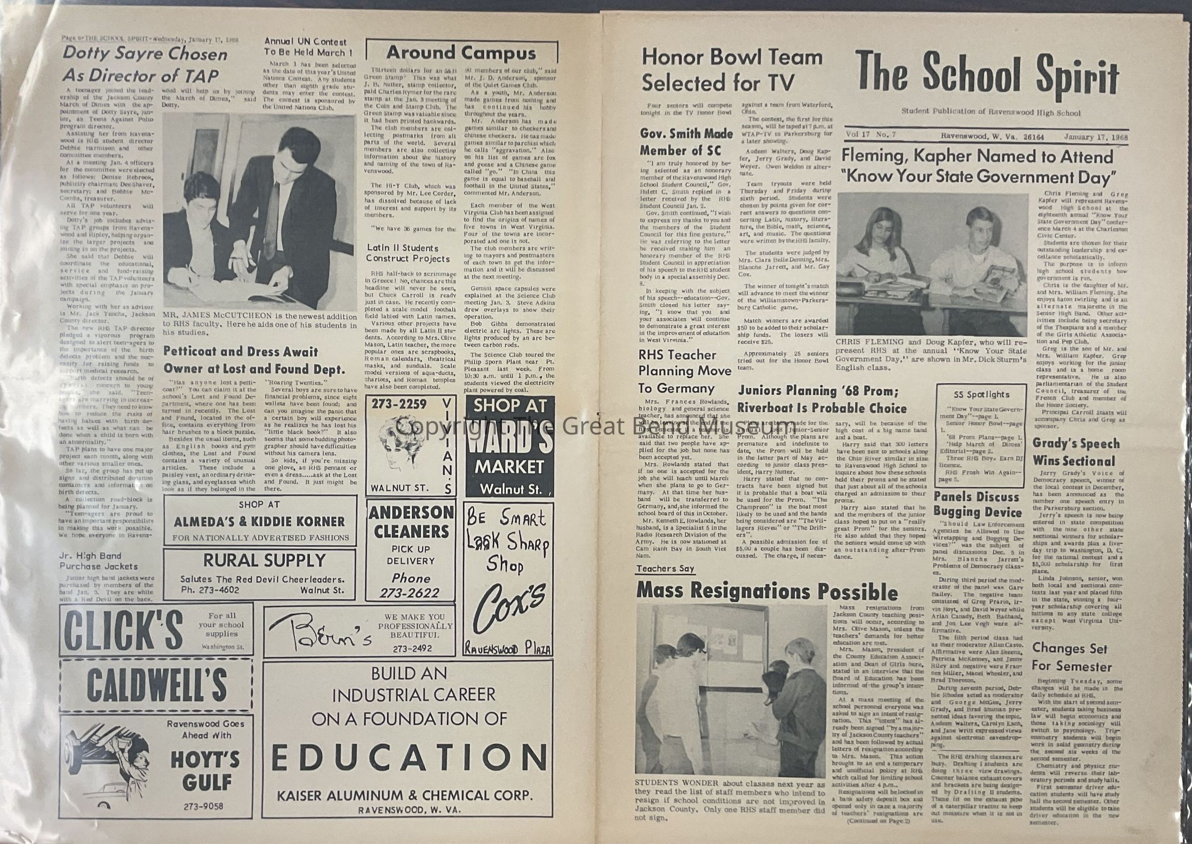 Vol. 17, No.7 - 1/17/1968 - Articles: Chris Fleming and Doug Kapfer named to attend "Know your State Government Day"; Gou Smith made member of RHS Student Council; Juniors planning '68 prom- Riverboat is probable choice; mass resignations possible unless teachers demands for better education are met; Jerry Grady's speech wins sectional - voice of democracy; three RHS boys earn Disc Jockey Licenses - Irvin Hoyt, Bob Drake, Bryce Turner; Students audition for All State Band (21); student of the month Sharon Hartley by FBLA. Red Devils stand 3-3 after crushing Wahama; Metmen stop spencer, Fall to wirt county; RHS Frosh win again - record 4-0 Dotty Sayre chosen as Director of TAP (Teens Against Polio)Acquisition