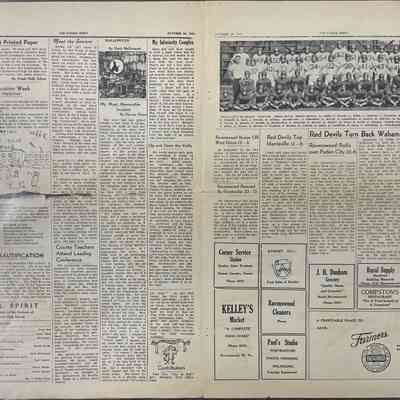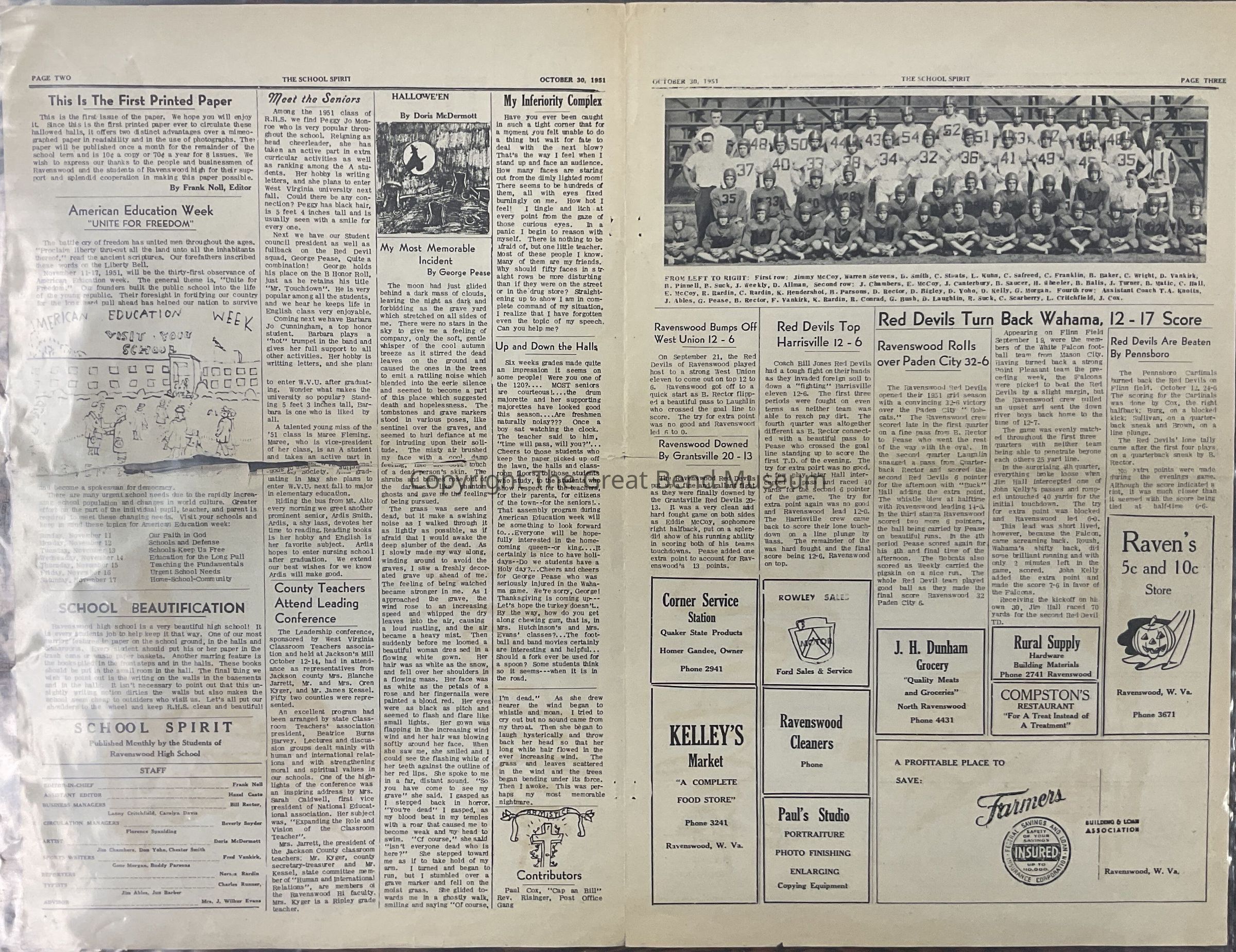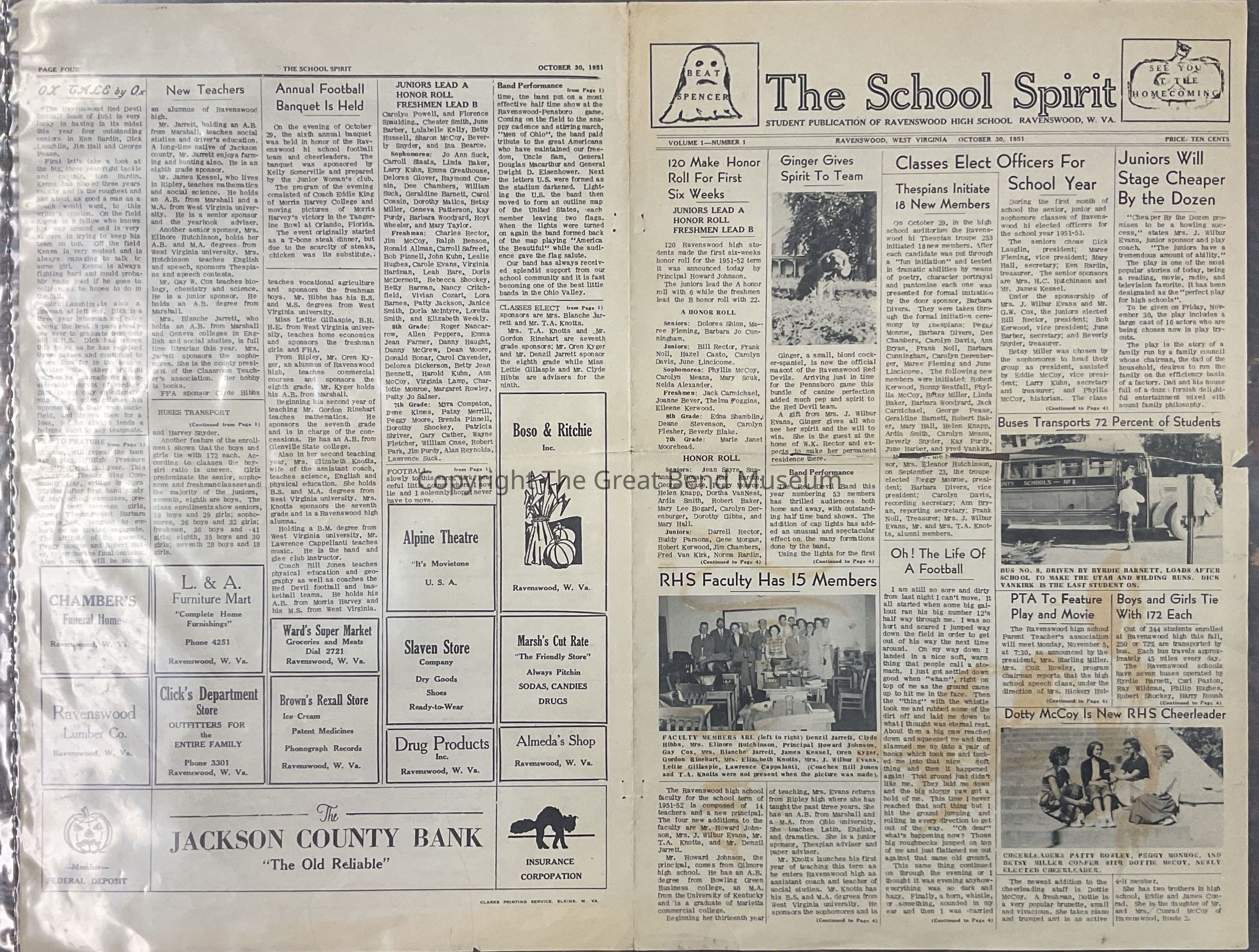This was the first edition of "The School Spirit" Vol.1,No.1 10/30/1951 - Articles: 120 make honor roll, classes elect officers; Junior play "cheaper by the Dozen", Faculty has 15 members; buses transport 72% of students.