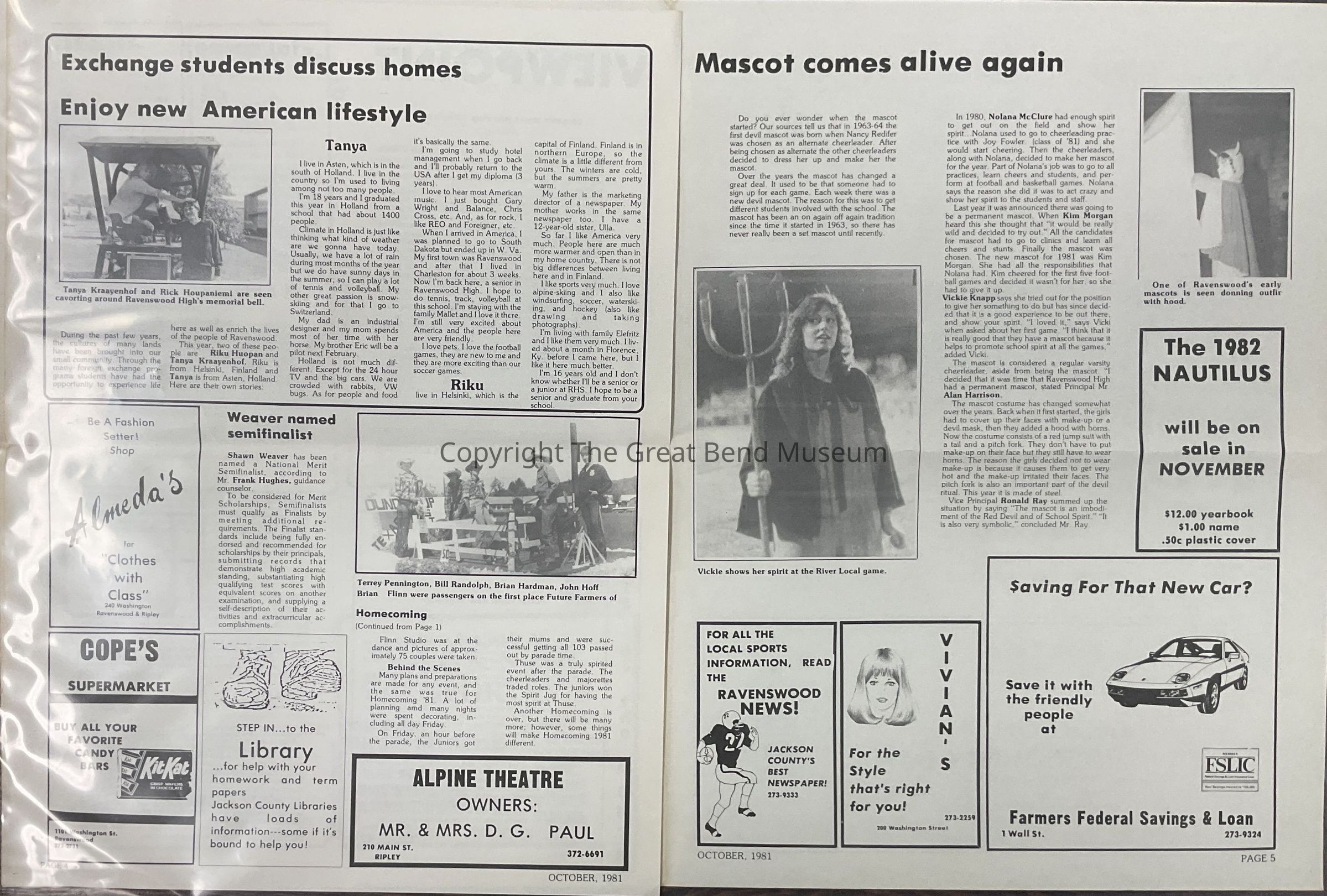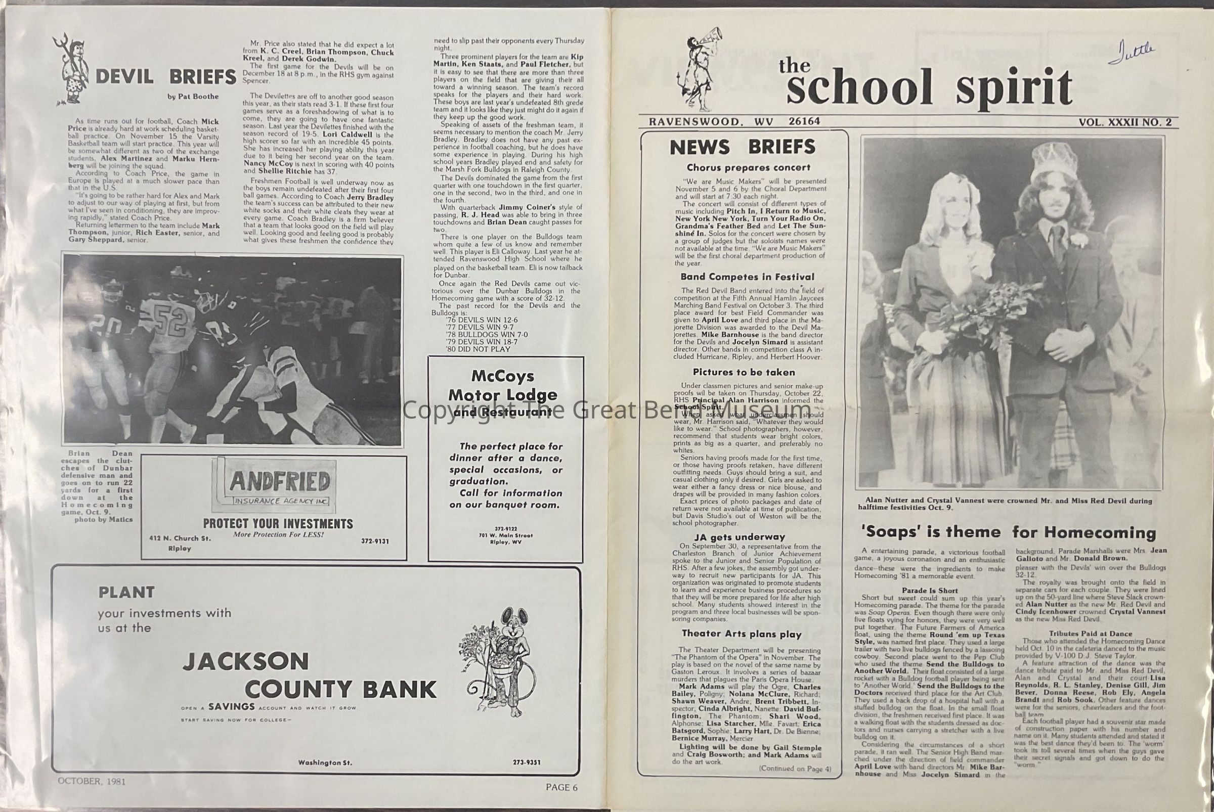 Vol XXXII, No.2, 10/1981 - Articles: soaps is theme for homecoming - Alan Nutter + Crystal Vannest crowned mr and miss Red Devil/picture; news briefs - chorus prepares concert, band competes in festival; JA gets underway; Theater arts plan play - The Phantom of the Opera; exchange students discuss homes, enjoy ew american lifestyle - Tanya Kraayenhof - Asten Holland and Riku Houpaniemi - Helsink, Finland; Shawn Weaver names semifinalist national merit; viewpoint - students arent showing school spirit; editorial corner - administrations still concentrating on "Family"; movie of the month - American Werewolf; horror takes new dimension, by Bill Walters; mascot comes alive - Vickie Knapp/picture; Devil briefs, by Pat Boothe, boys football with picture.Acquisition