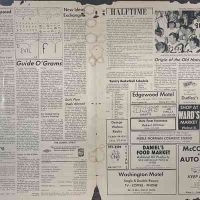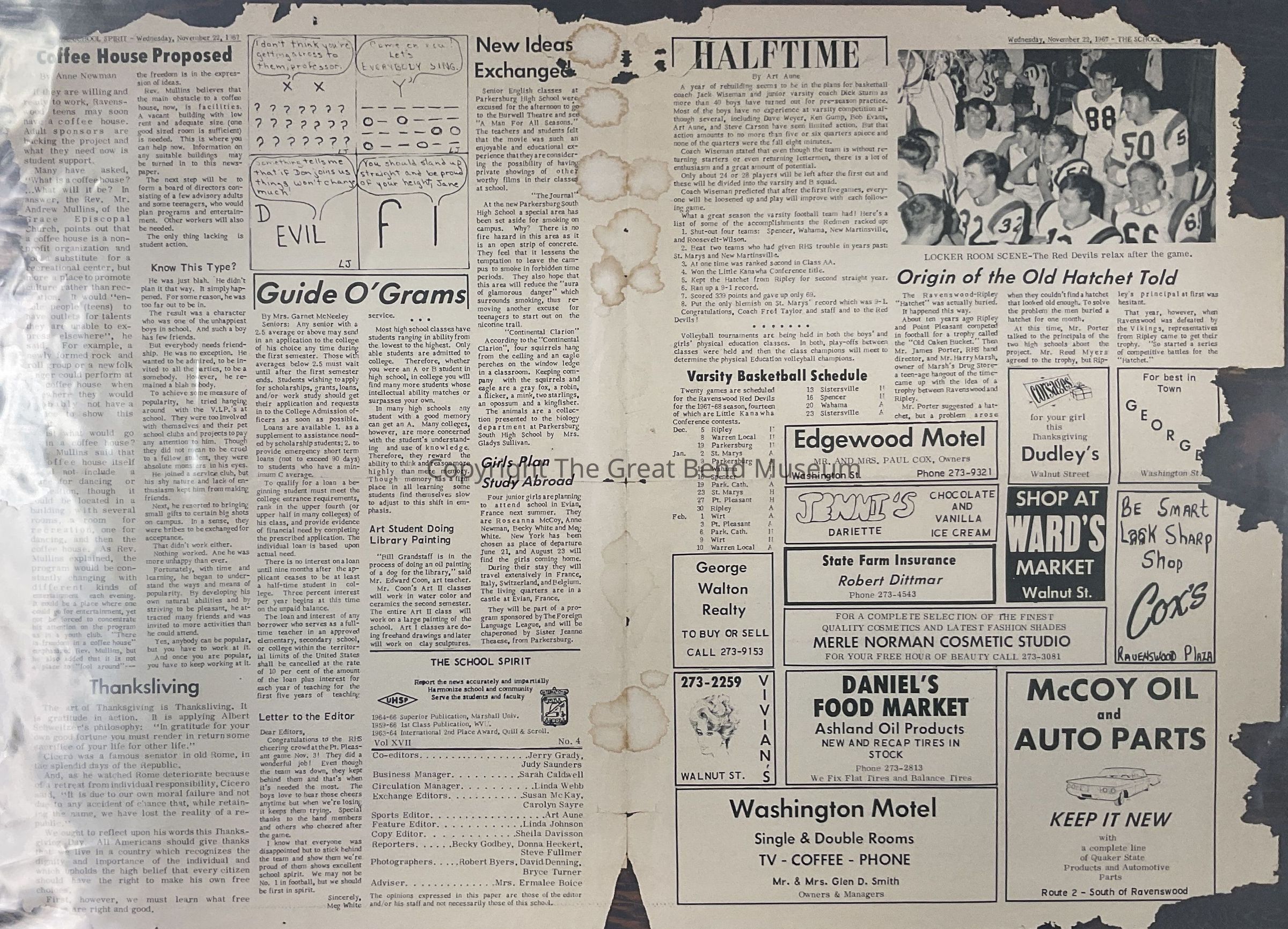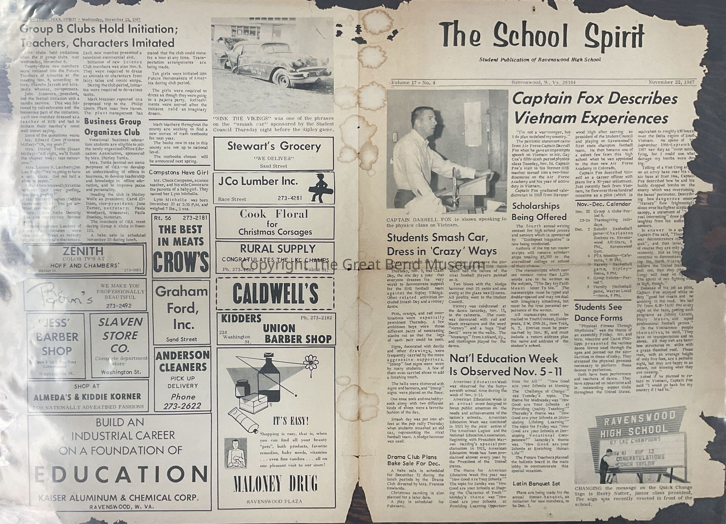 Vol.17, No.4 - 11/22/1967 - Articles: Captain Darrell Fox describes Vietnam experiences; scholarships being offered - sponsored by "Guidepost magazine; students smash car, dress in "Crazy ways" in support of RHS Football Team; National Education Week is observed Nov. 5-11; girls plan study abroad - Roseanna McCoy, Anne Newman, Becky White, Meg White; origin of the old hatchet told - between Ravenswood and Ripley Football; varsity basketball schedule; business group organizes club - office education.