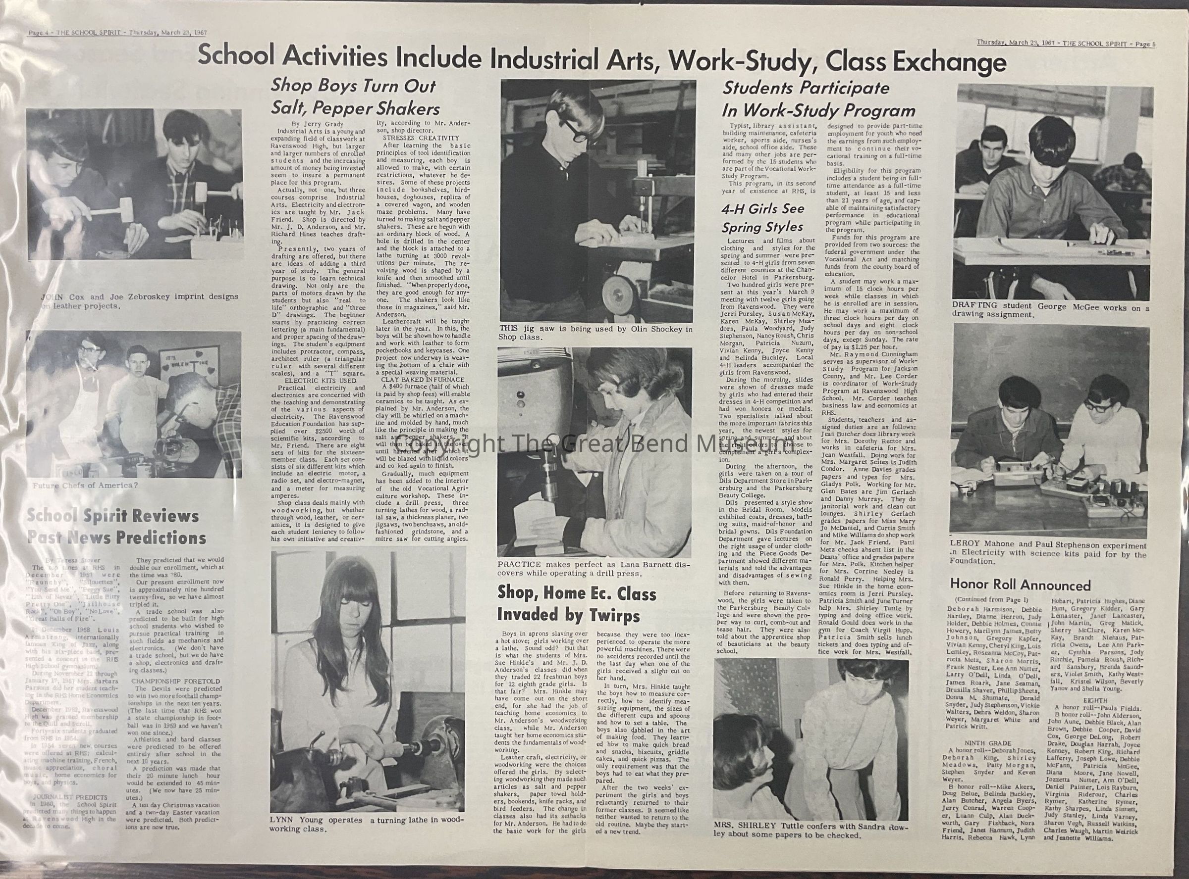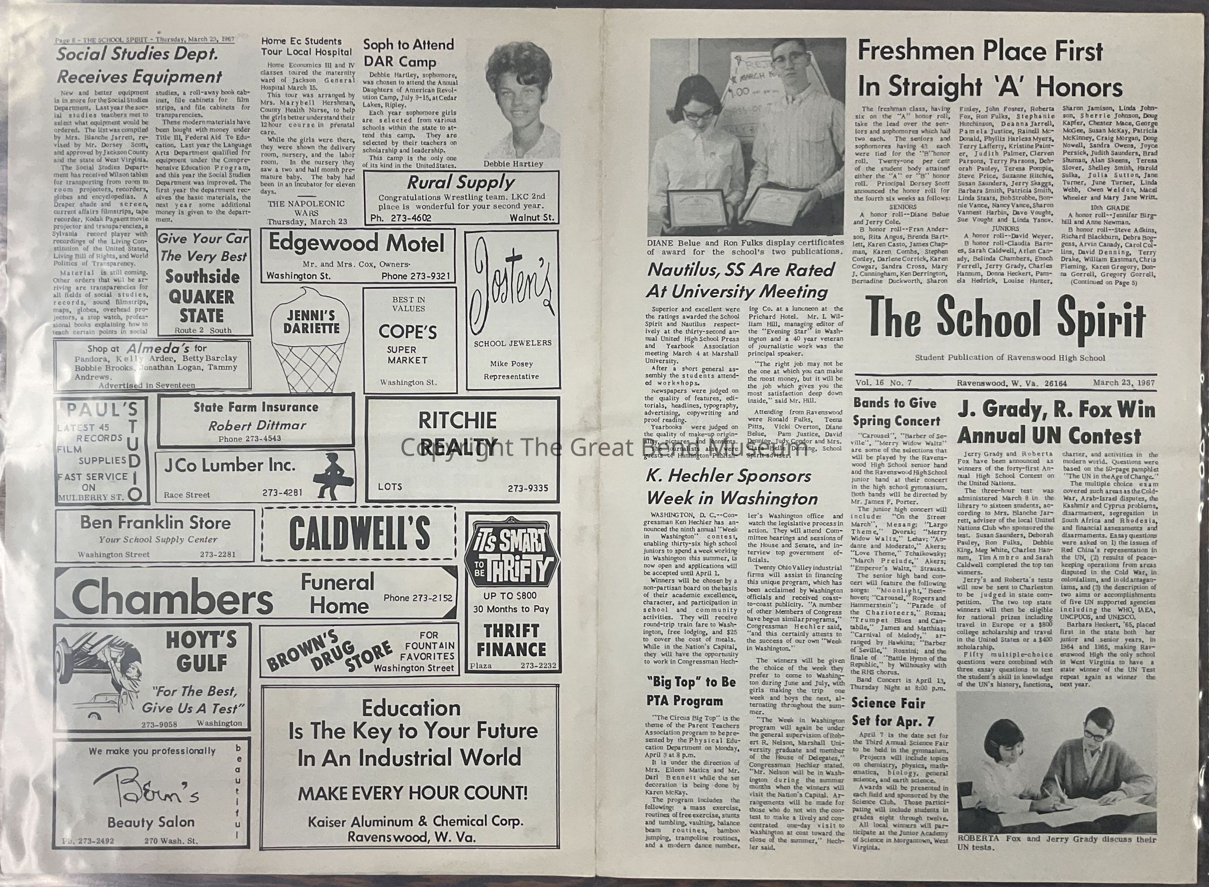 Vol.16, No.7 - 3/23/1967 - Articles: Jerry Grady + Roberta Fox win annual U.N. contest; nautilus, school spirit are rated at university meeting - 32 annual united H.S. press and yearbook association meeting at Marshall U; freshman place first in straight A honors; Ken Hechler sponsors week in washigton; red devils end season by winning sectional - basketball; school activities include industrial arts, work, study, class exchange; archery, tennis, tumbling taught in p.e.; social dept. receives equipment; sophomore to attend DAR camp. Debbie Hartley.