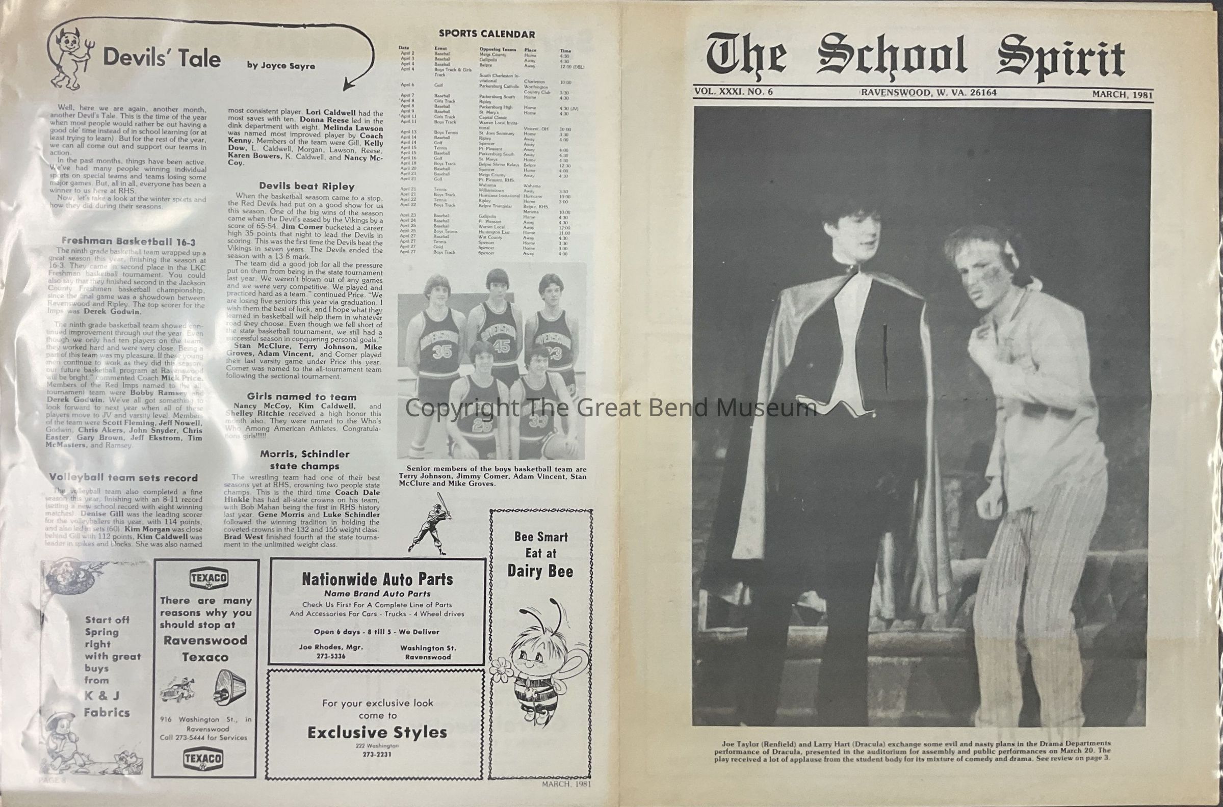 Vol XXXI, No 6 - 3/1981 - Articles: picture of Joe Taylor(renfield) and Larry Hart (Dracula) in performance of Dracula; viewpoint changes in RHS curriculum; country music may replace contemporary forms of music; Dracula reviews; music sets moods by Debbie Park; April Fools pages - brief news; juniors score high matics creates holiday, does canady exist? Faculty sets policy, students victimized, finch, brandt but store, Up Ray "Horses around"; foreign exchange student arrives- Marsha Martin. Bomber to compete - Jenny Schmidt, finalist in the miss teenage america contest with picture; coming soon to RHS - Danny II - starring Danny Clarkson with picture; curriculim changes by Lisa Smith; adult roles hold mock wedding with pictures; news briefs - library holds festival; students hold dance - spring dling; students attend dinner - American society of metals; colleges offer tests - CLEP; singers perform show; chorus chooses singer for All-State; spring sports begin seasons - tennis teams have 24 members; track plagued by inexperience; 11 report for golf; devils tale: freshman basketball 16-3; volleyball team sets record; devils beat ripley - basketball; girls names to team - who's who among american athletes - Nancy McCoy, Kim Caldwell, Shelley Ritchie, Morris, Schindler State champs - wrestling; picture of seniors of basketball team